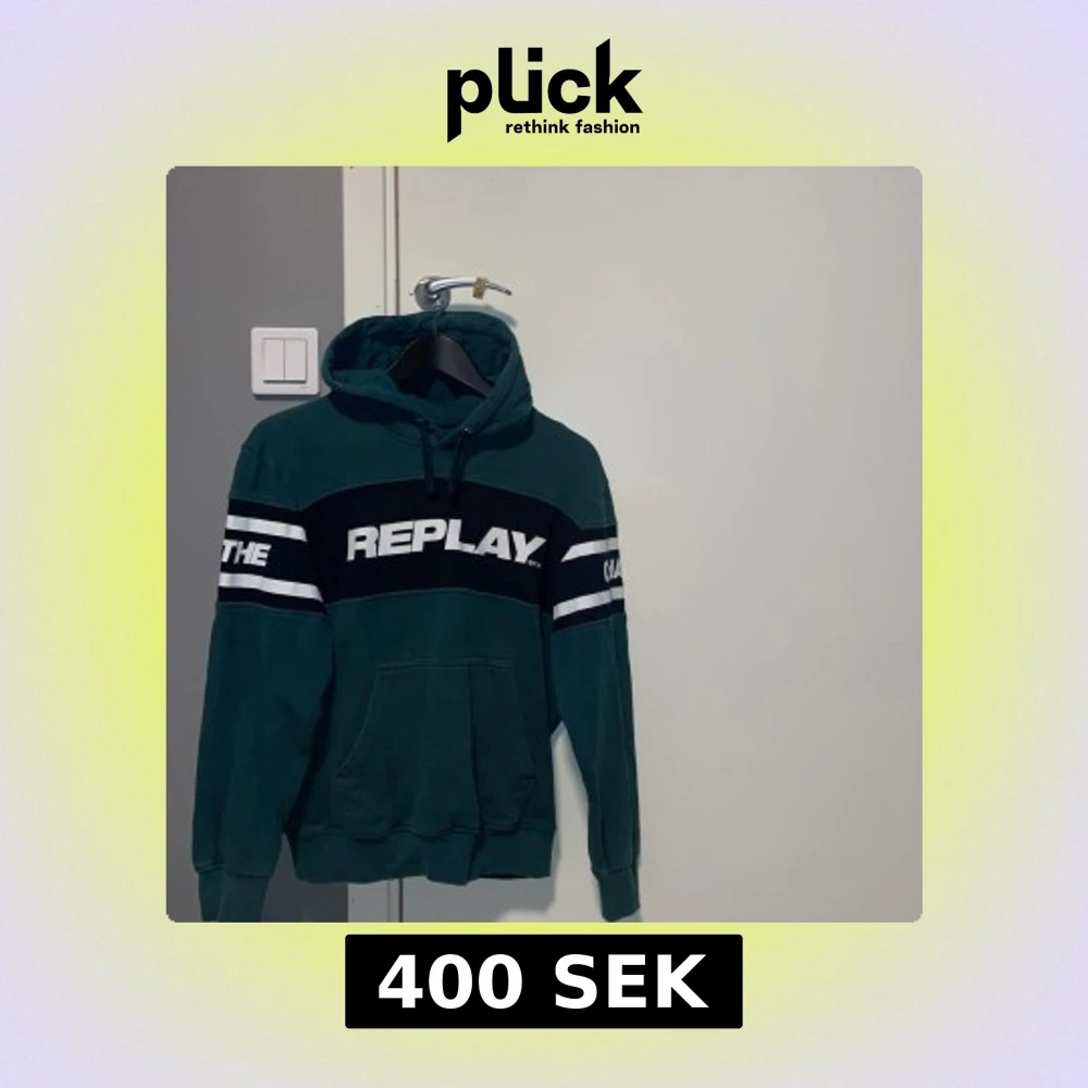 Snygg grön hoodie från Replay med svart och vit text på bröstet. Den har en klassisk känguruficka och justerbar huva med snören. Perfekt för en avslappnad stil. OBS FÄRGEN PÅ TRÖJAN SER INTE UT SÅDÄR! Mer bilder kan skickas vid köp!