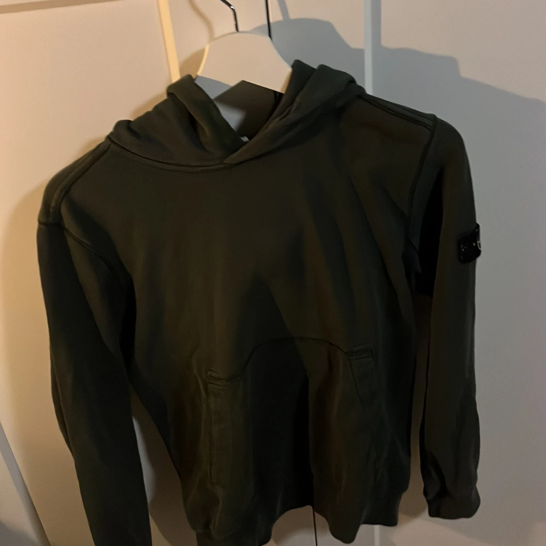Säljer en snygg grön hoodie från Stone Island Junior. Den har en klassisk design med huva och en praktisk magficka. På ärmen finns det ikoniska Stone Island-märket. Perfekt för en stilren och avslappnad look.