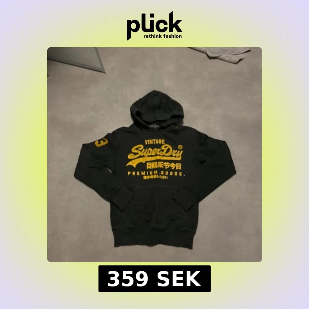 Svart hoodie från Superdry med stor gul vintage-print på bröstet och japanska tecken. Siffran 23 i gult på vänster ärm. Klassisk huva och känguruficka framtill. Mjuk bomullskvalitet och ribbade muddar vid ärmslut och nederkant.