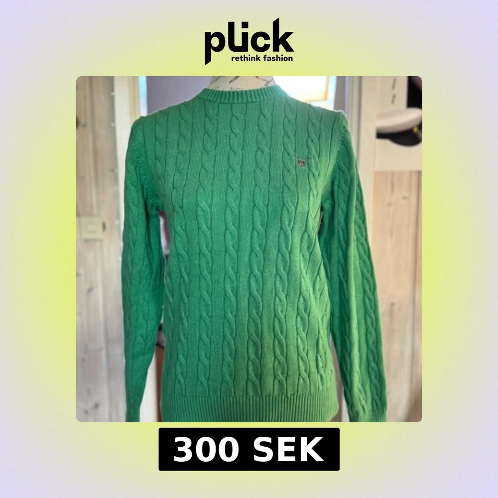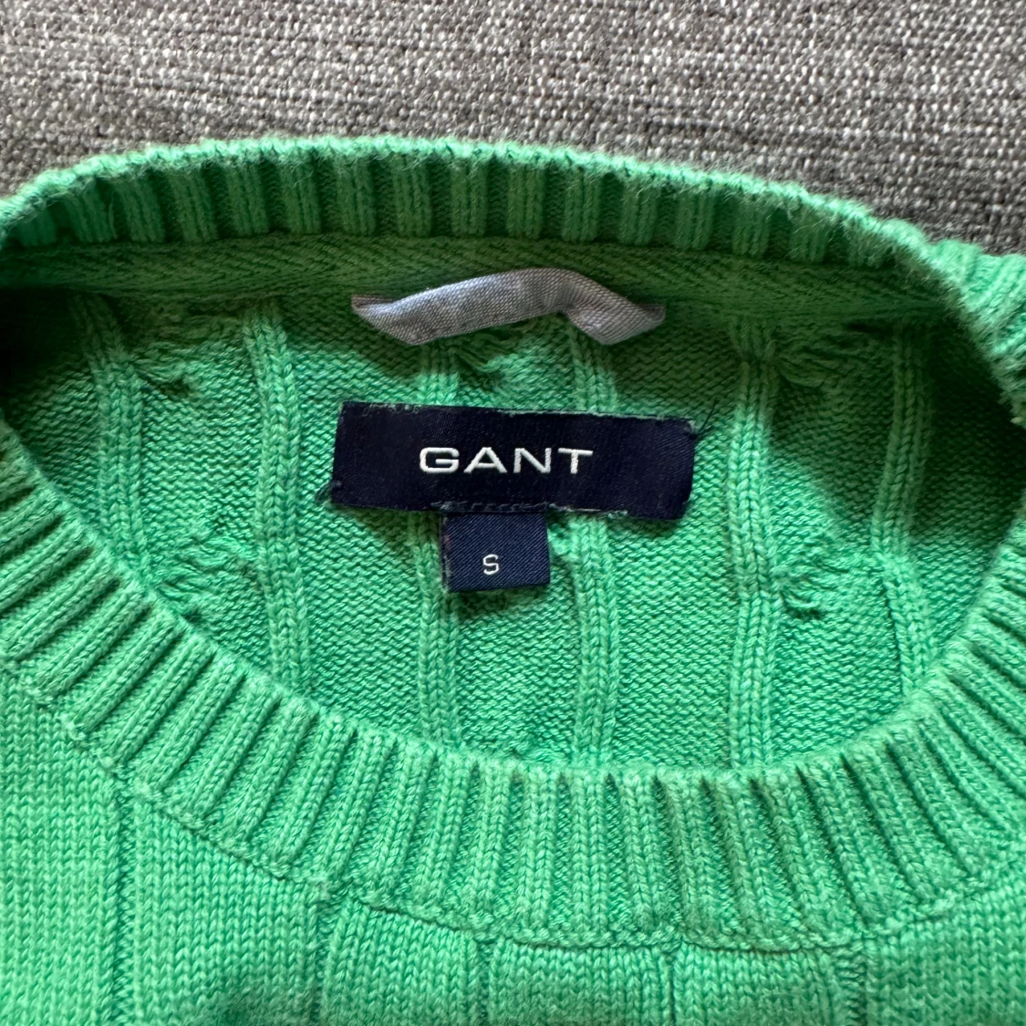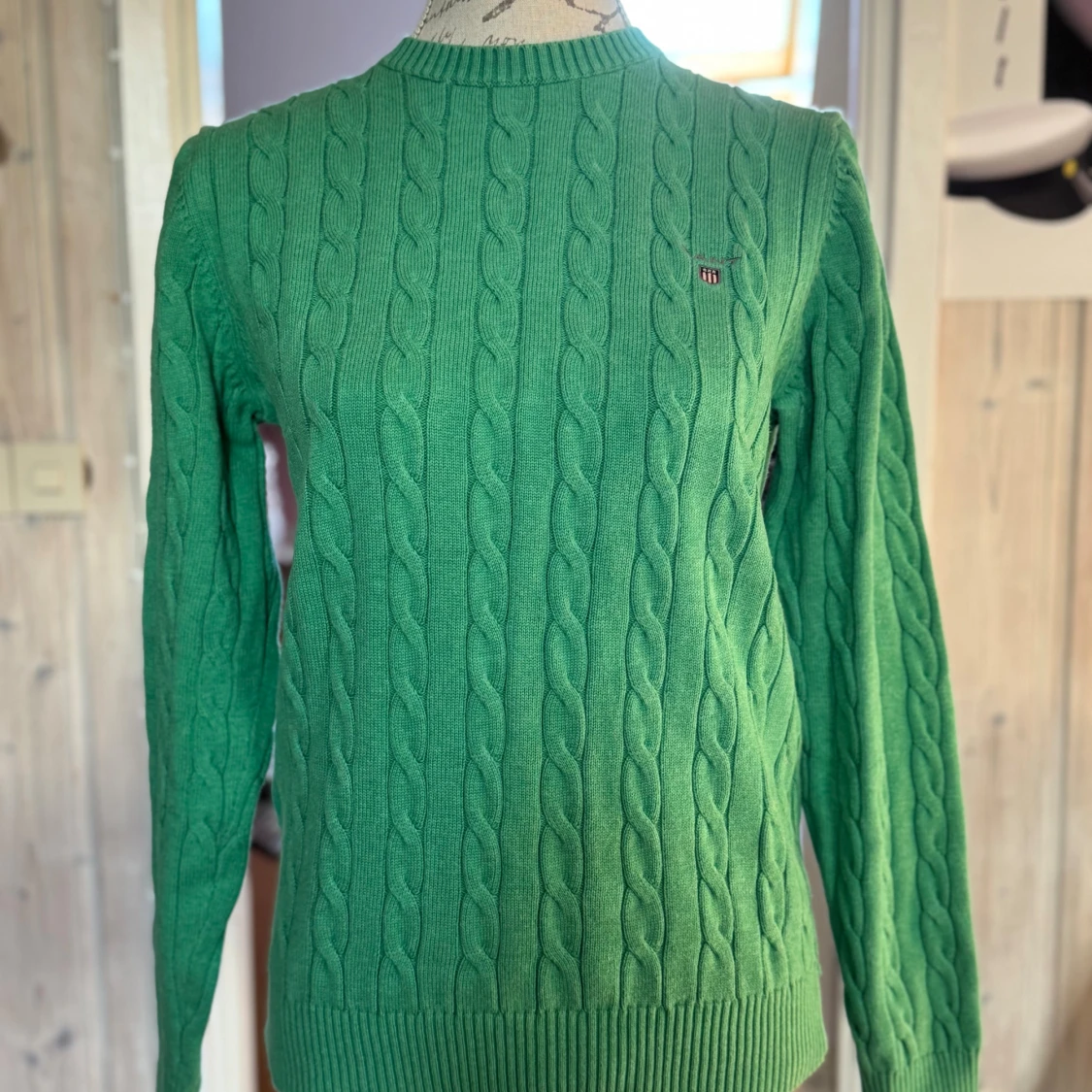 Snygg grön kabelstickad tröja från GANT med rund halsringning och diskret logga på bröstet. Tröjan har långa ärmar och ribbade muddar vid ärmslut och nederkant.