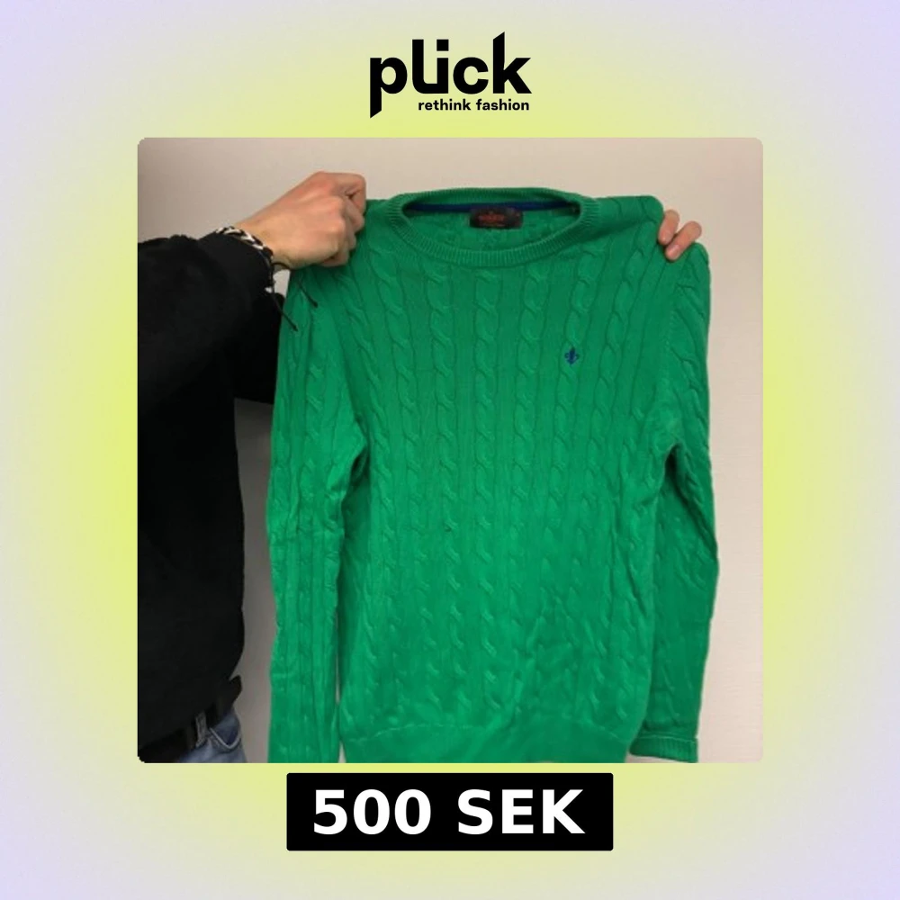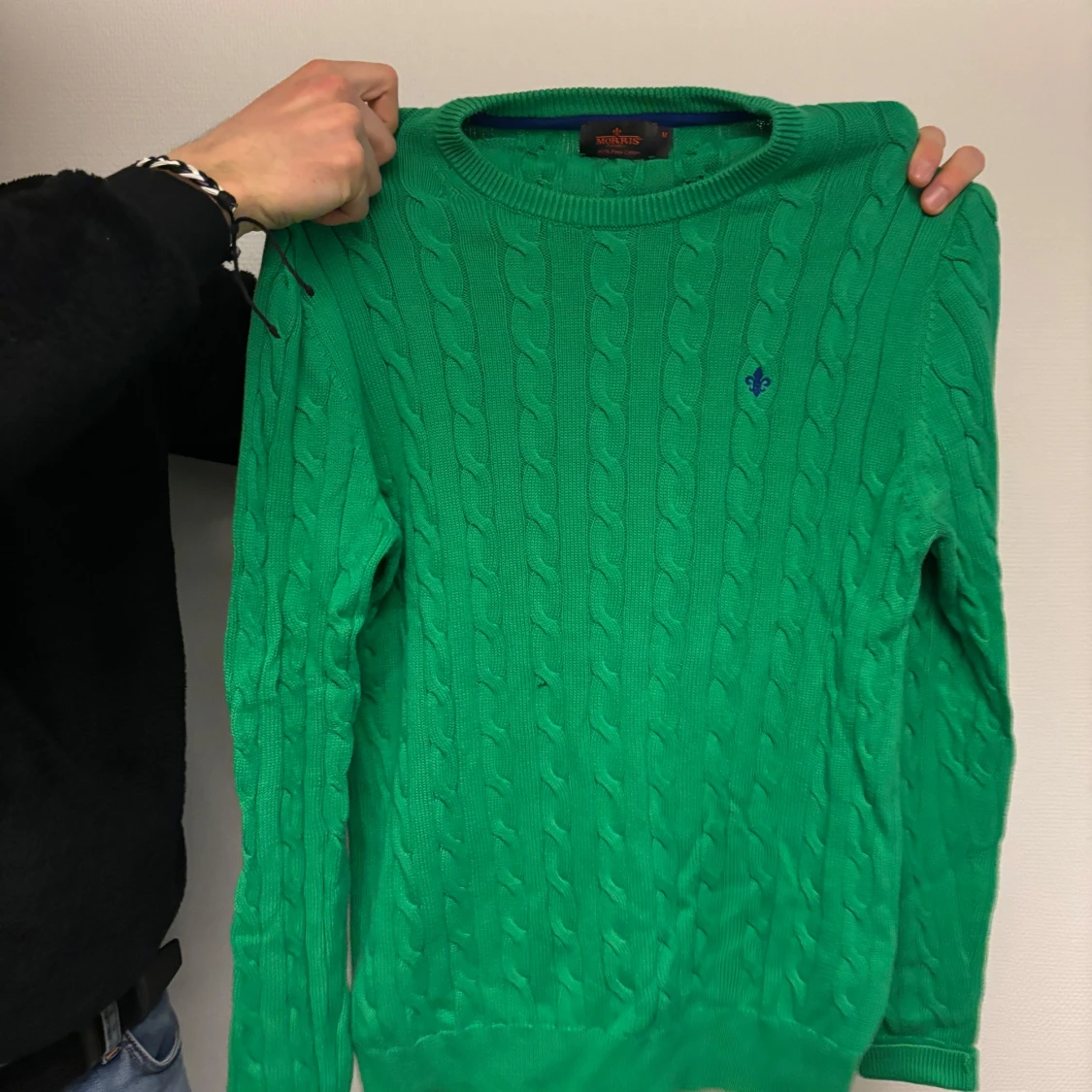 Säljer en snygg grön kabelstickad tröja från Morris med deras ikoniska logga broderad på bröstet. Tröjan har långa ärmar och en rund halsringning. Perfekt för en stilren look!