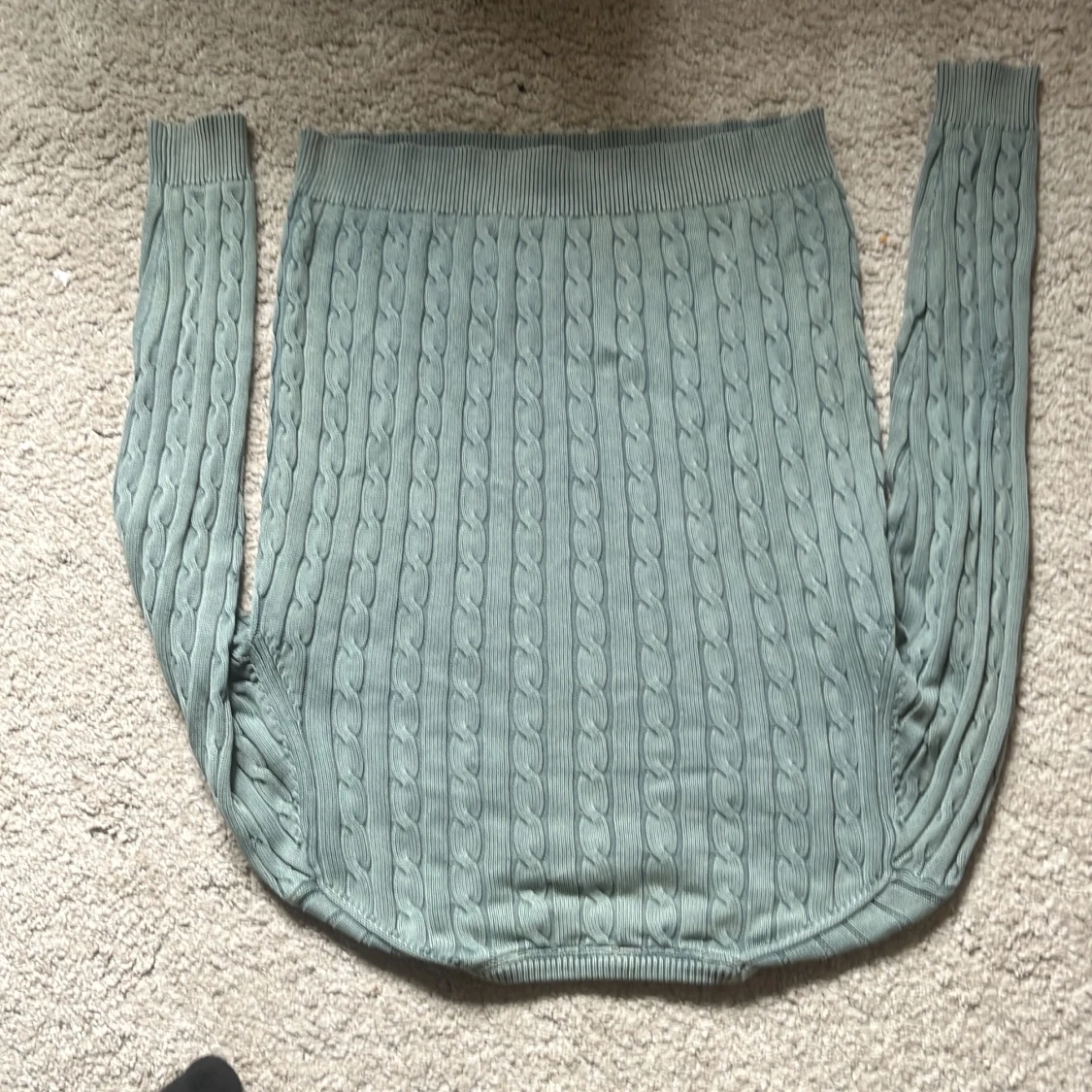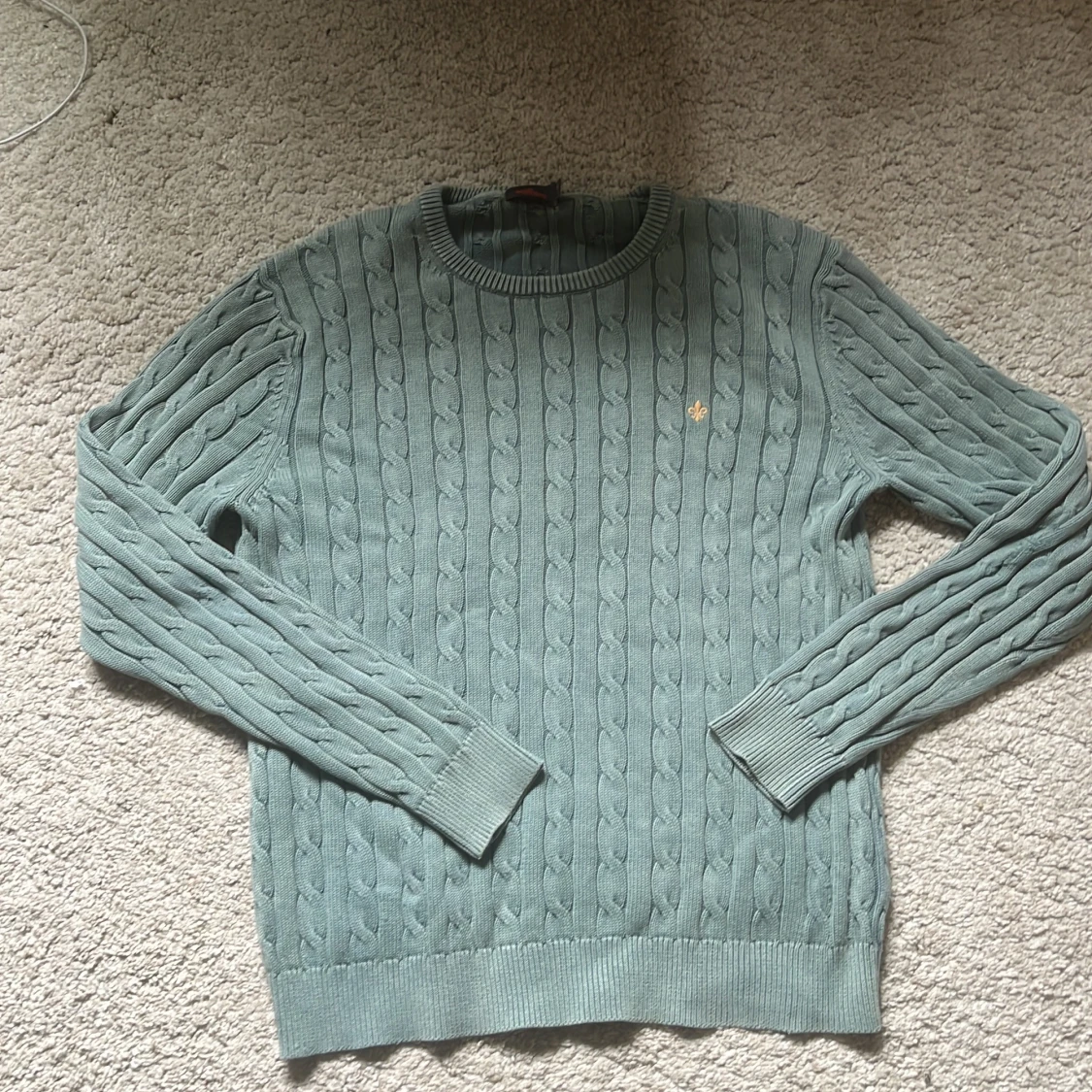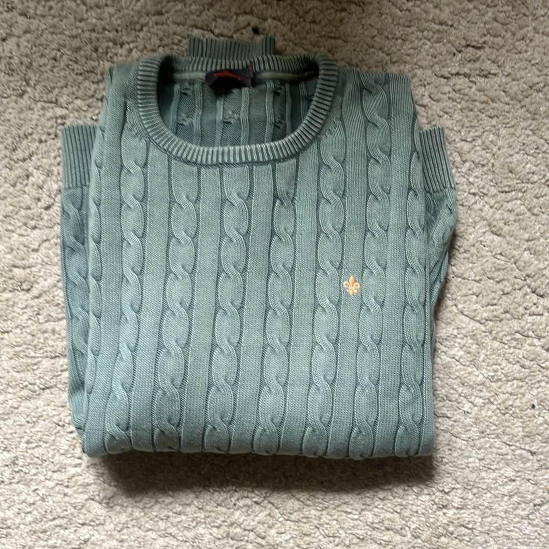 Snygg kabelstickad tröja i dämpad grön färg från Morris. Tröjan har rund hals, långa ärmar och en liten gul broderad logga på bröstet. Perfekt för lager-på-lager och chill stil. Ribbstickade muddar vid ärmslut och nederkant.