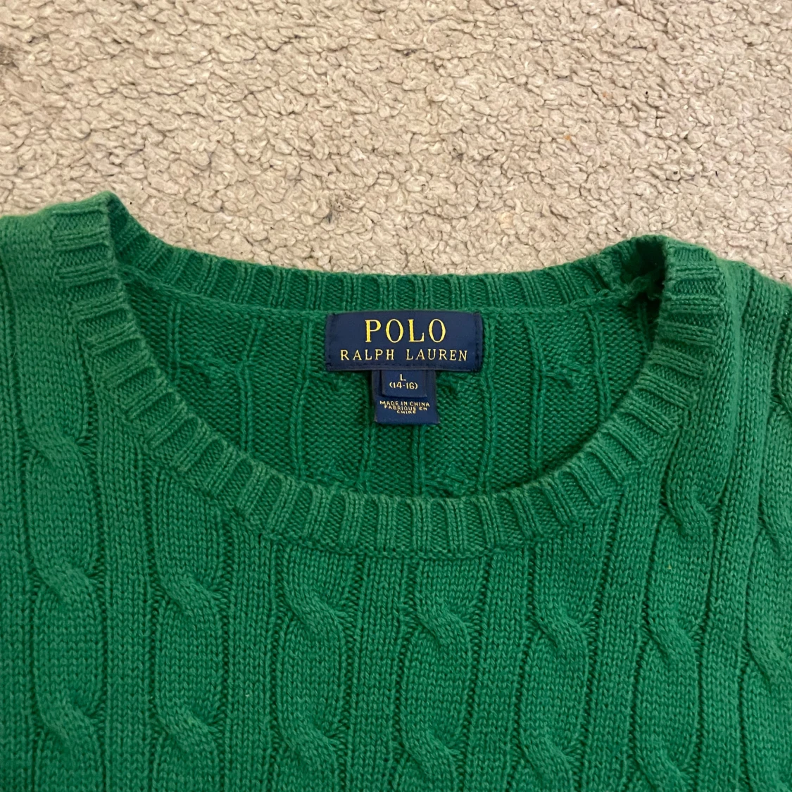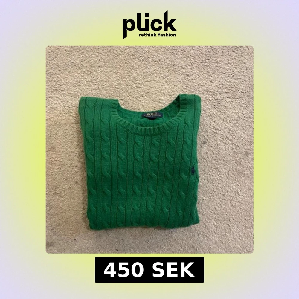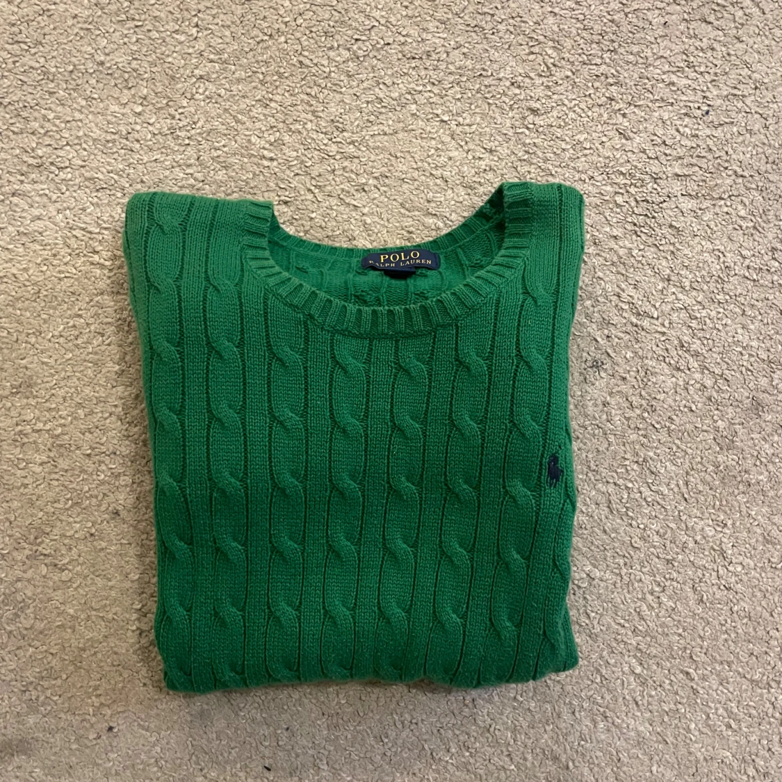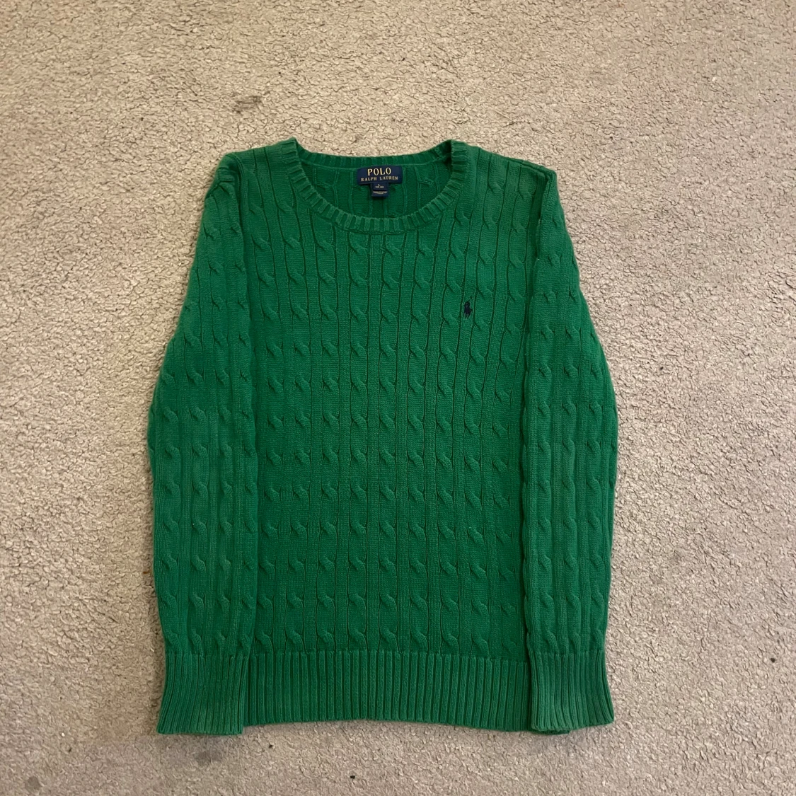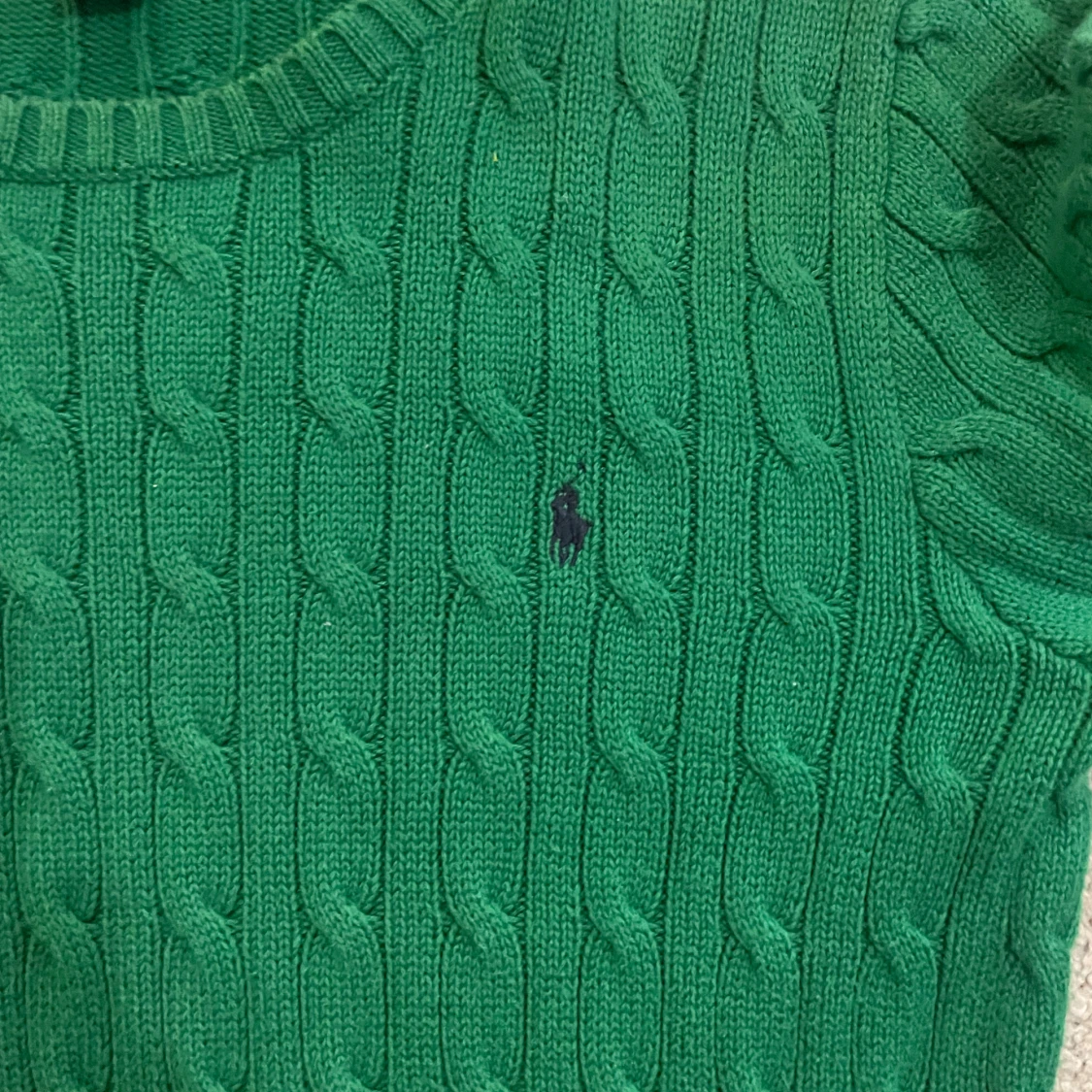 Snygg grön kabelstickad tröja från Polo Ralph Lauren med rund hals och diskret broderad logga på bröstet. Tröjan har långa ärmar och ribbade muddar vid hals, ärmslut och nederkant. Perfekt för dig som gillar klassisk stil med en modern touch.