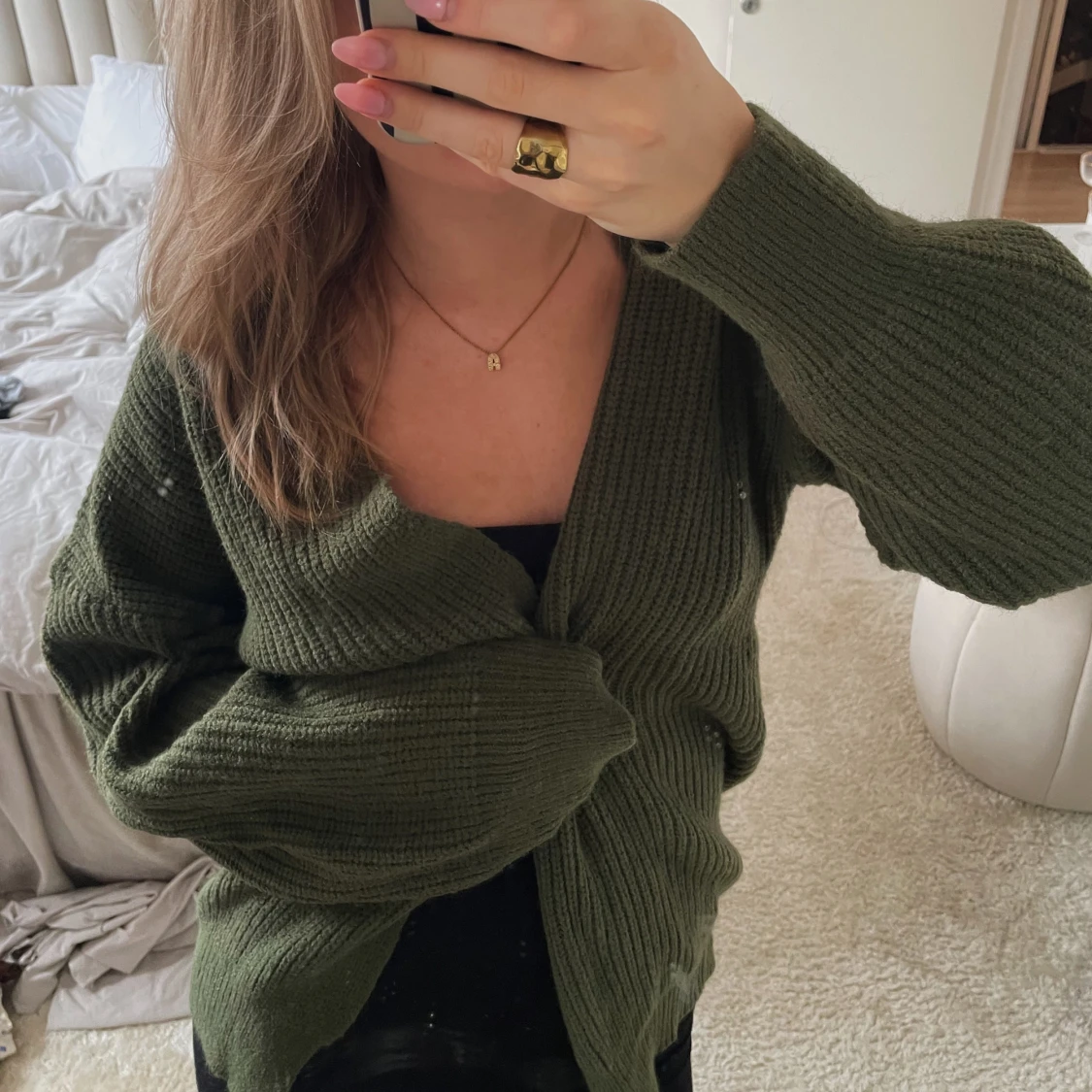 Superfin grön/oliv kofta som tyvärr inte kommer till användning. Vet ej märke eller storlek då lappen är bortklippt men skulle säga att den passar xs-m. Pris kan diskuteras🥰