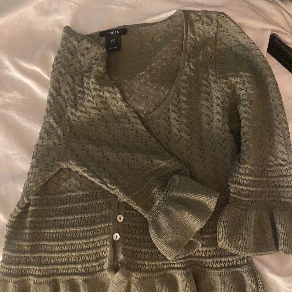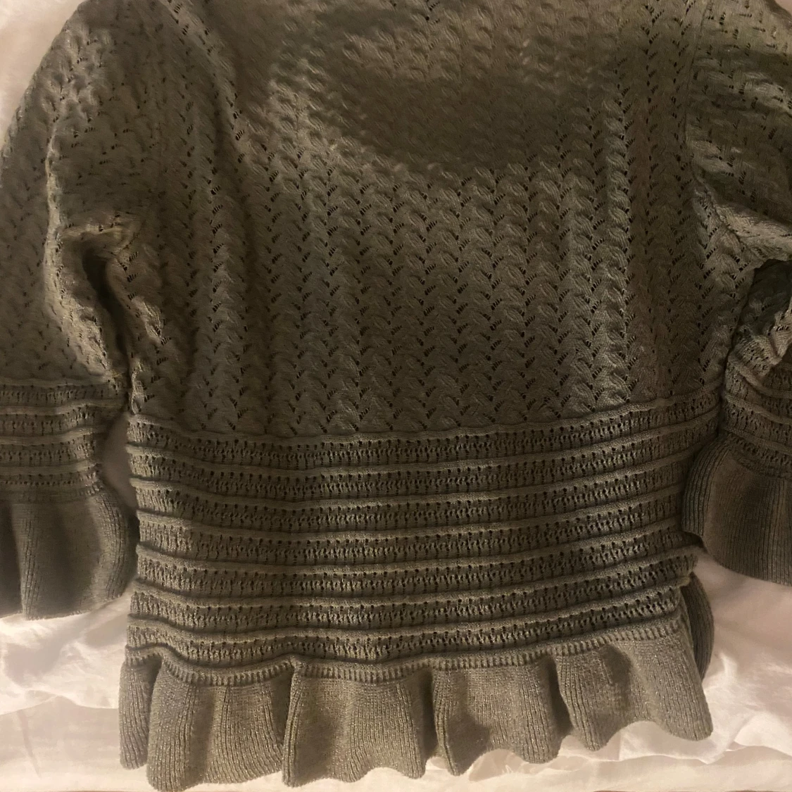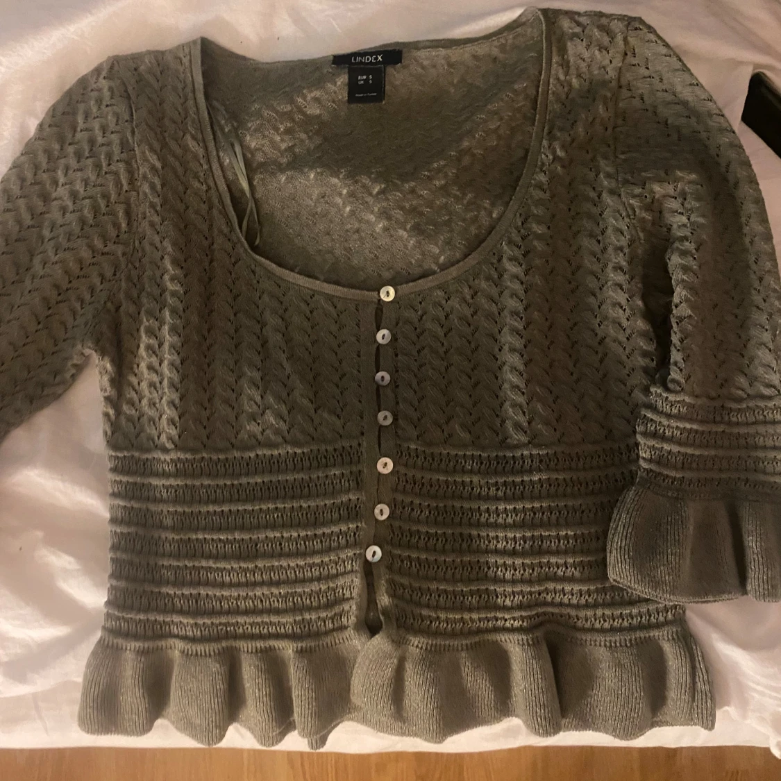 Supersöt grön stickad kofta från Lindex med dekorativa knappar framtill och volangdetaljer vid nederkant och ärmslut. Koftan har ett snyggt hålmönster och trekvartsärmar.