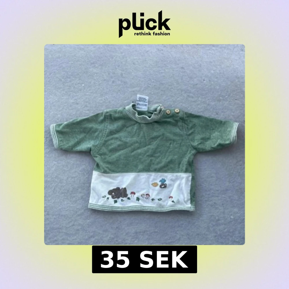 Söt grön kortärmad tröja i 100% bomull med randig krage och knappar på axeln. Nedtill finns en vit panel med broderade svampar, löv, björn och fåglar. Perfekt för dig som gillar gulliga detaljer och naturinspirerat motiv.