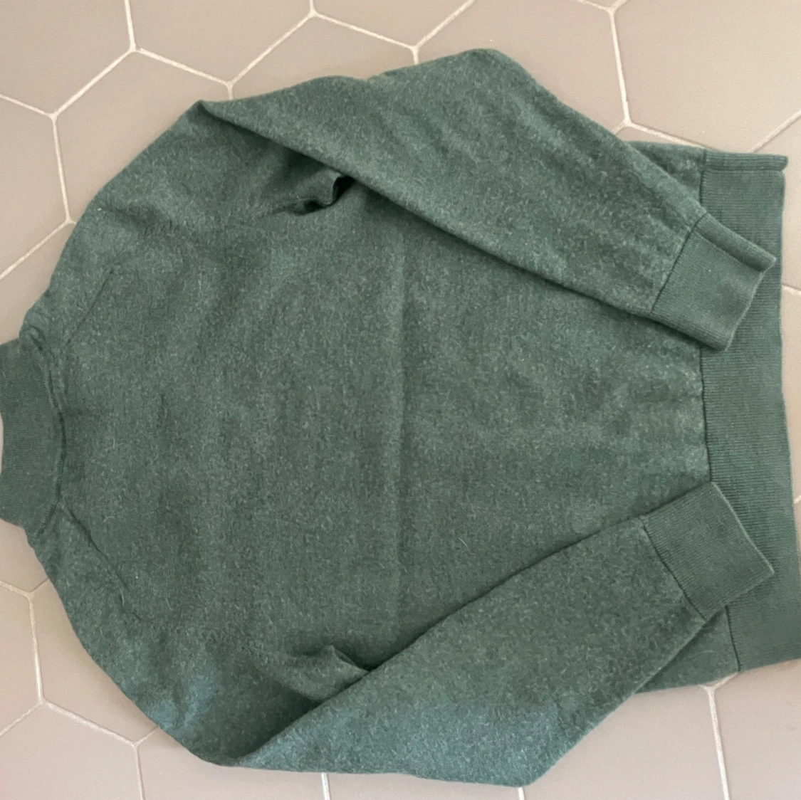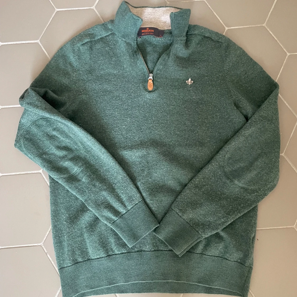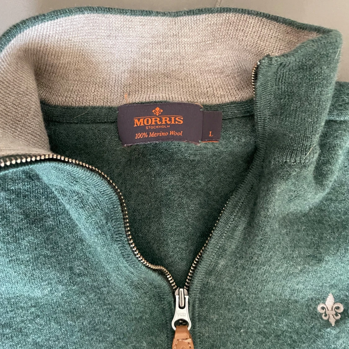 Snygg grön tröja från Morris i 100% merinoull med halv dragkedja och diskret logga på bröstet. Tröjan har ribbade muddar och hög krage, perfekt för lager-på-lager. Passar dig som gillar klassisk men avslappnad stil. Den är i barn large men den passar mig som har xs nu på mina kläder.