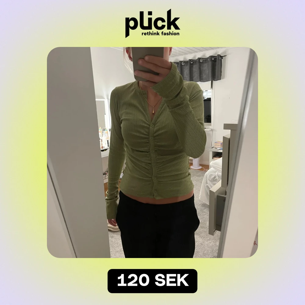 Säljer en snygg grön ribbad topp med knappar hela vägen ner. Den är croppad och har en tight passform som framhäver figuren. Perfekt för festliga tillfällen!! Liten i storleken och passar som en storlek S