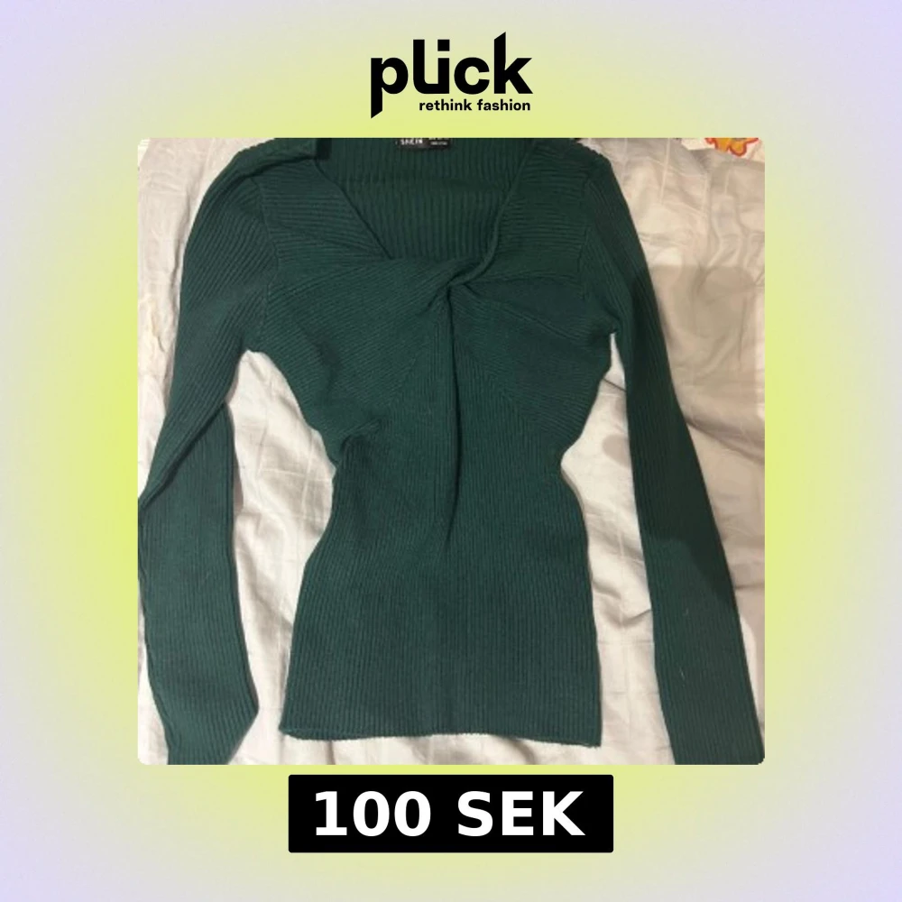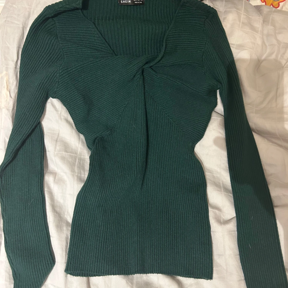 Mörkgrön ribbad tröja från SHEIN med lång ärm och snygg twistad detalj framtill vid halsringningen. Tröjan har en figurnära passform och är perfekt för dig som gillar stilrena plagg med en twist.