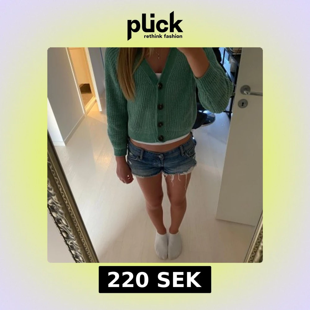 Säljer en grön stickad kofta från H&M med fyra stora knappar framtill. Koftan är croppad och har långärmad design med ribbade muddar och v-ringad hals. Storlek 134/140 men passar super på mig med Xs/S