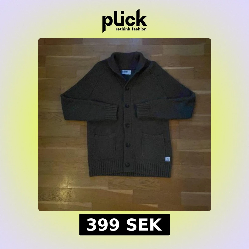 Säljer en snygg mörkgrön stickad kofta/cardigan från Dobber. Den har en klassisk design med knappar framtill och två praktiska fickor. Perfekt för kyligare dagar och ger en stilren look.