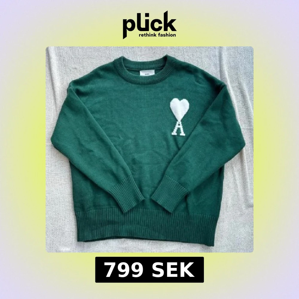 Snygg mörkgrön stickad tröja från Ami med vit hjärt- och A-logga på bröstet. Tröjan har rund hals, ribbade muddar och är tillverkad i mjuk ull. Perfekt för dig som gillar stilrena detaljer och vill ha något som sticker ut lite extra.