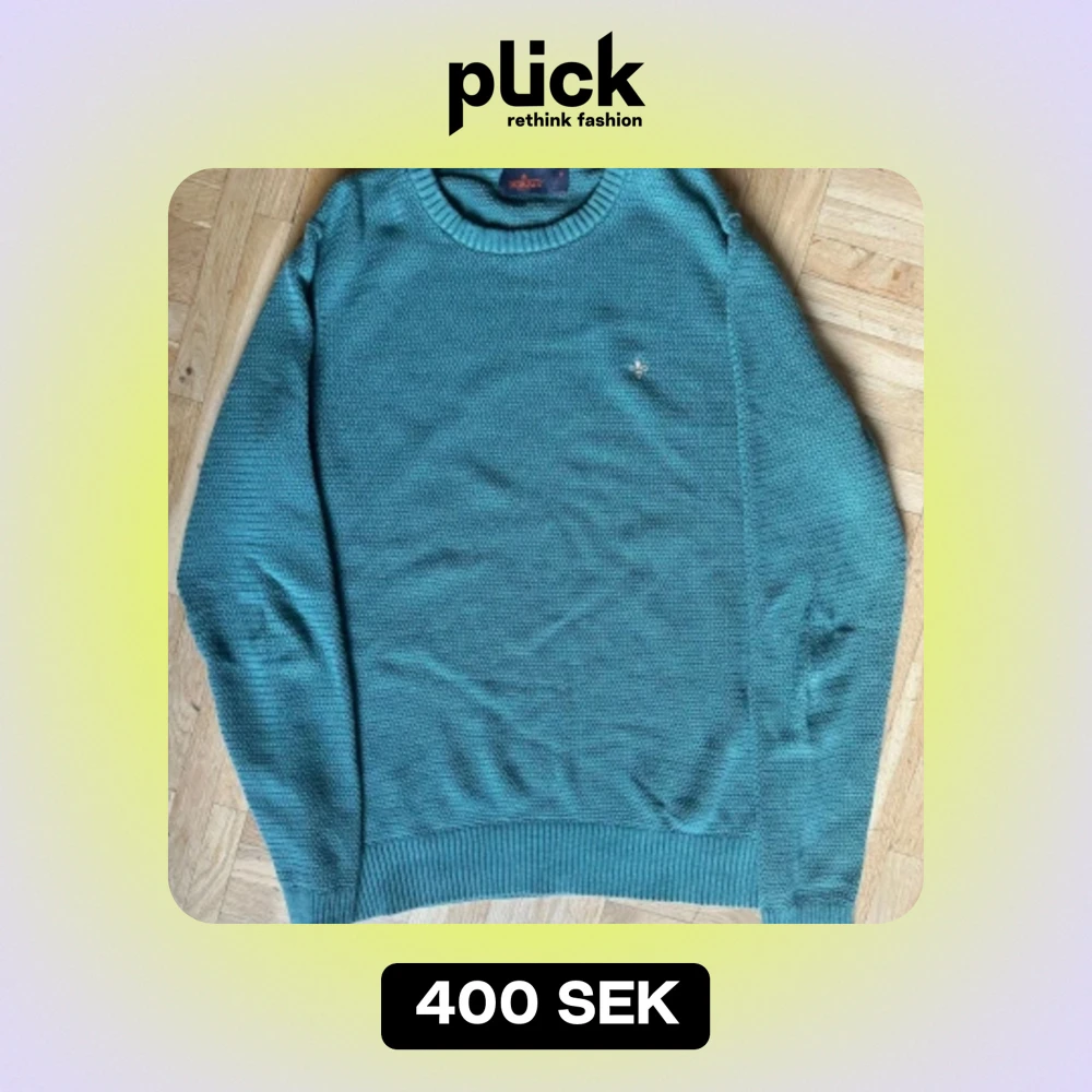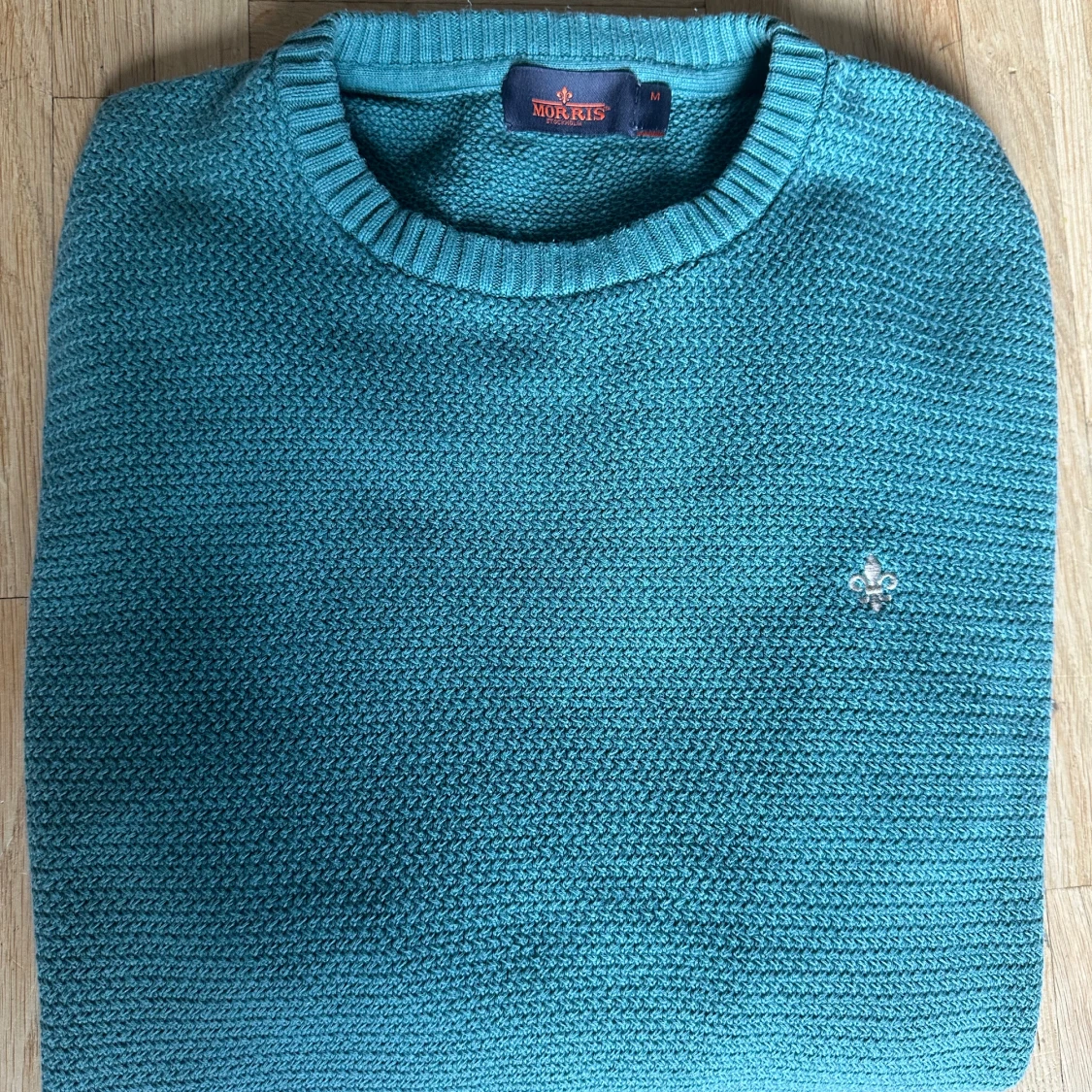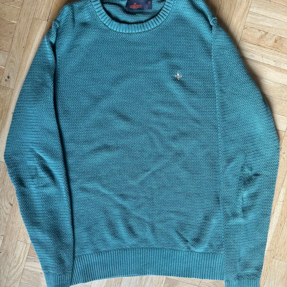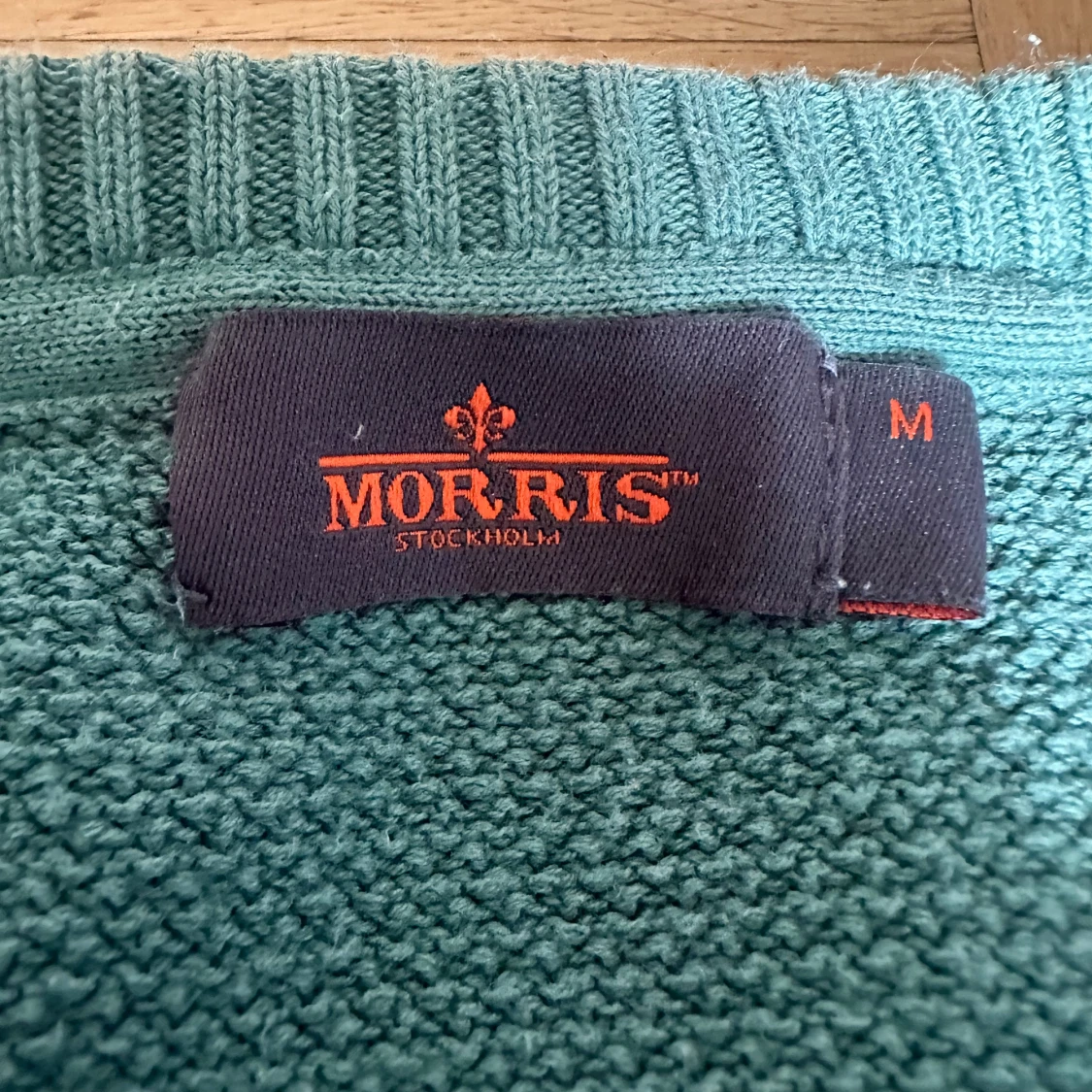 En oliv grön stickad tröja från Morris med rund halsringning. Tröjan har långa ärmar och en liten broderad detalj på bröstet. Skicket på tröjan är ca en 9/10.