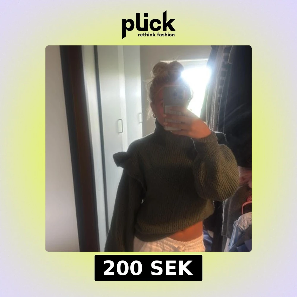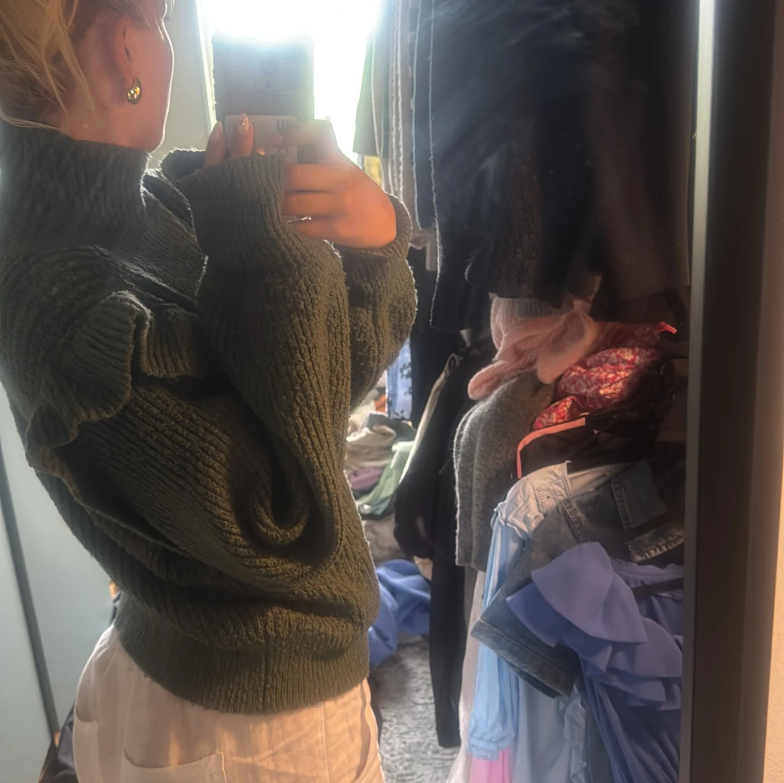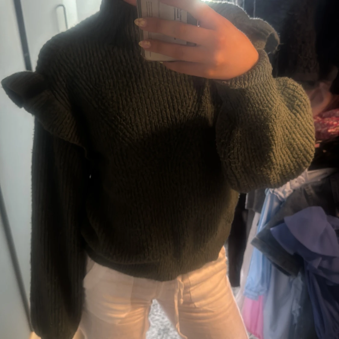 Mysig mörkgrön stickad tröja med höga volangdetaljer på axlarna och ballongärmar. Tröjan har hög hals och är croppad i modellen, vilket ger en trendig och avslappnad vibe. Perfekt för kyliga dagar när du vill vara både bekväm och snygg.