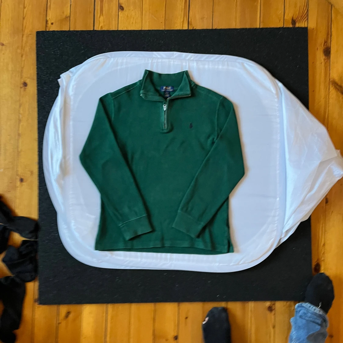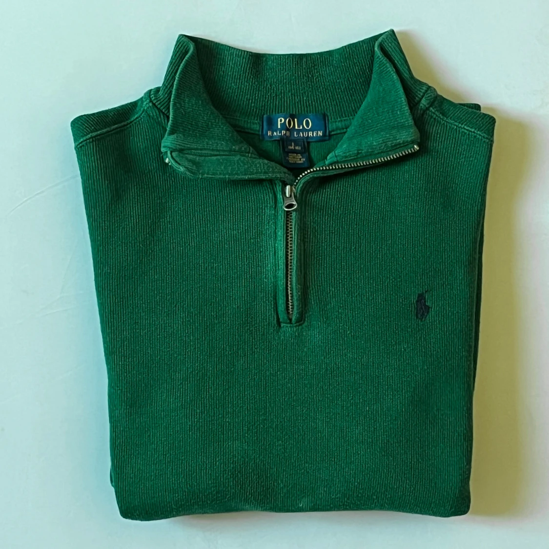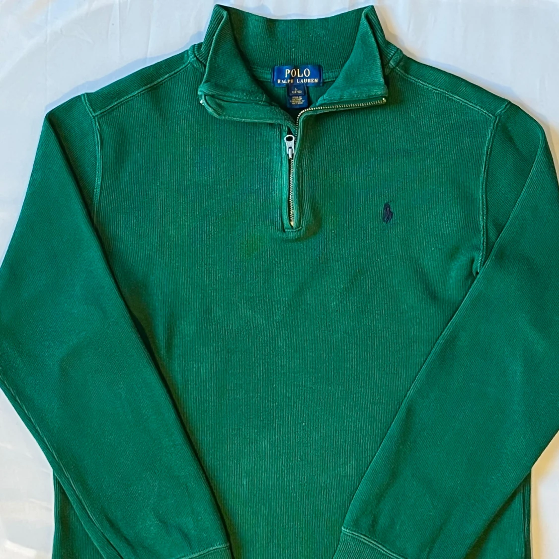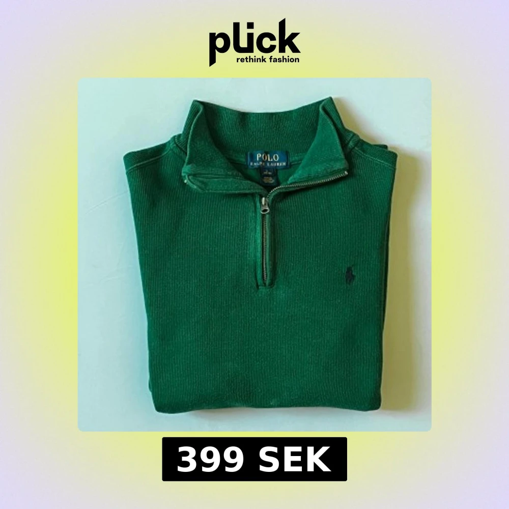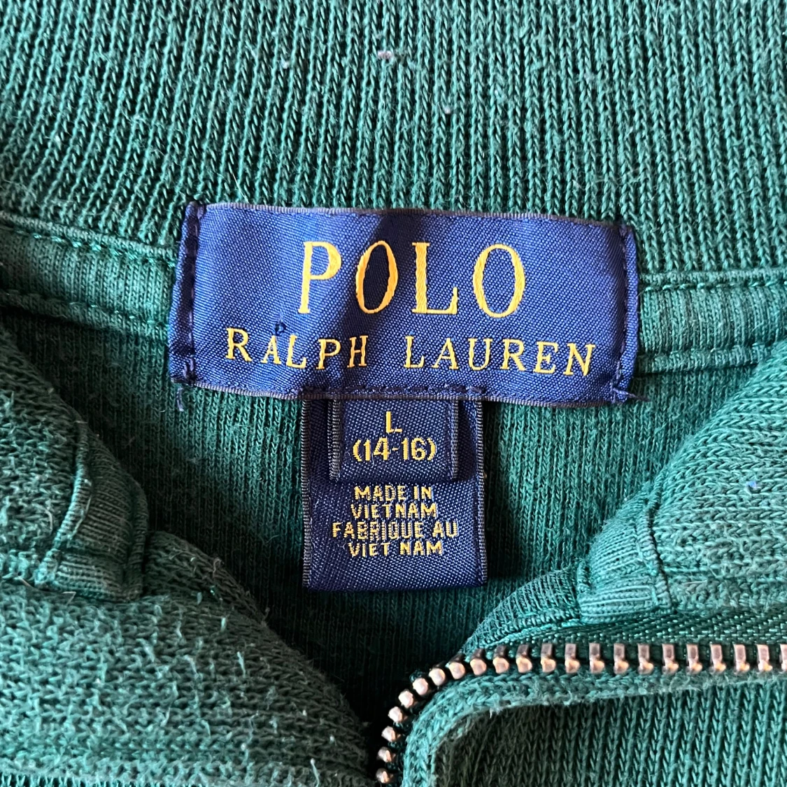 Snygg grön stickad tröja från Polo Ralph Lauren med half zip och hög krage. Tröjan har långärmade ärmar och klassisk broderad logga på bröstet. Perfekt för dig som gillar stilrena och tidlösa plagg med en sportig touch. Storlek S (Står L men är åldrarna 14-16, därav passar den S). Tredje bilden visar bäst hur färgen ser ut i verkligheten.
