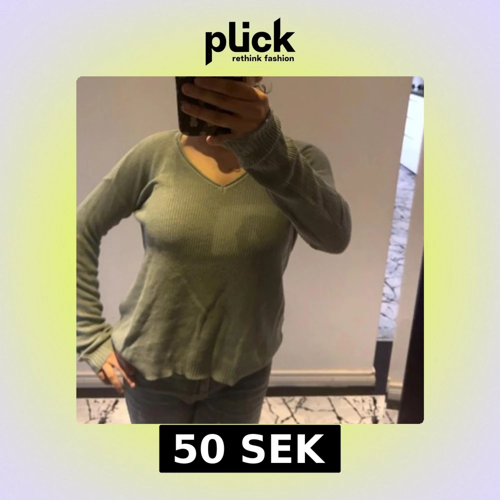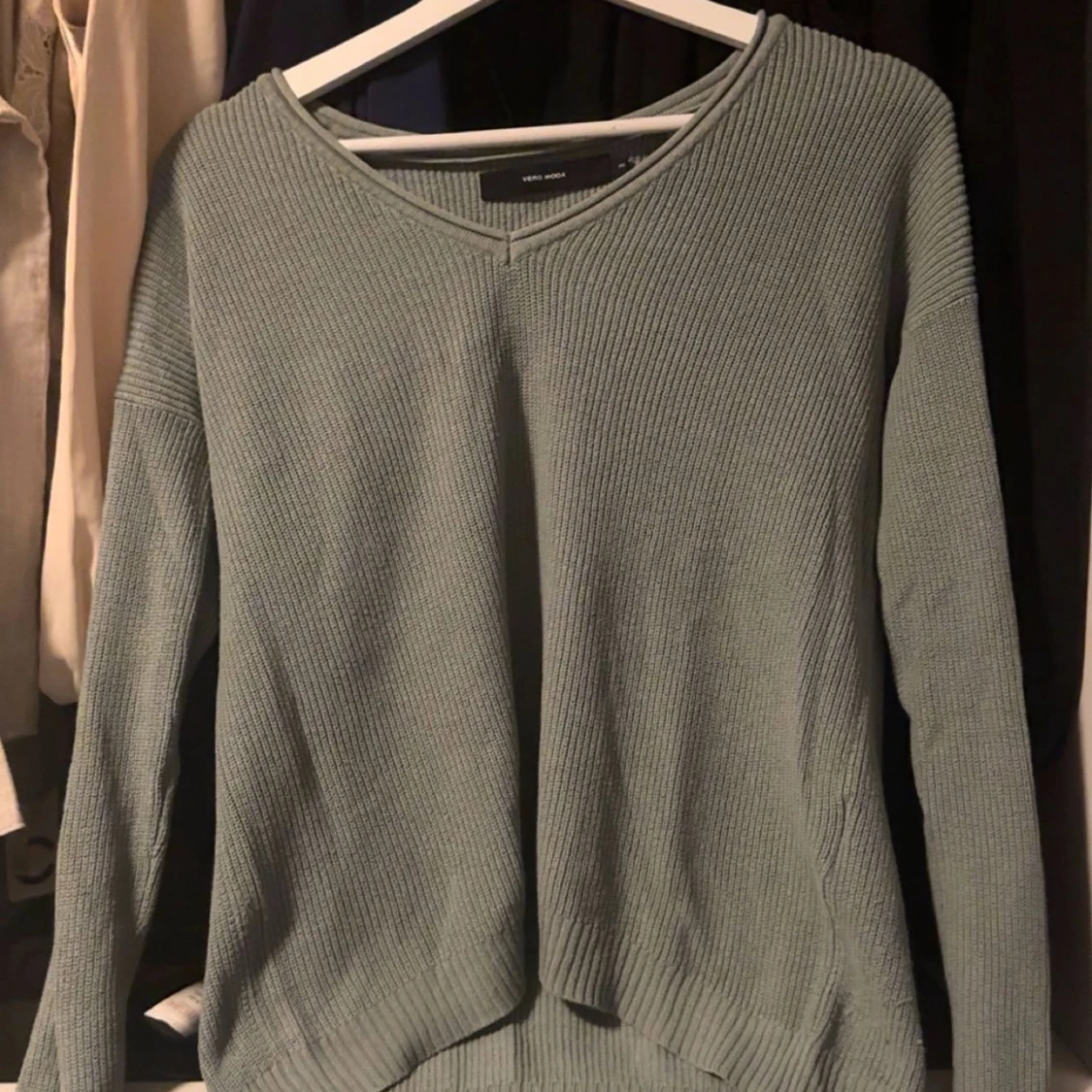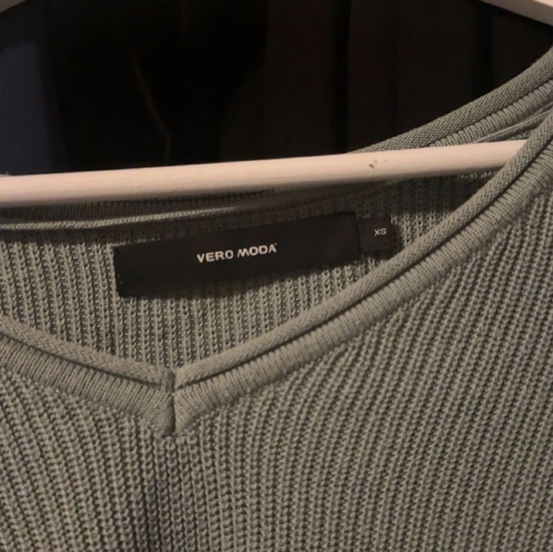 Snygg grön stickad tröja från Vero Moda i storlek XS. Tröjan har v-ringad hals, ribbad struktur och långa ärmar. Perfekt för dig som gillar en chill och enkel stil. Passar till jeans eller kjol och är superbekväm att ha på sig.