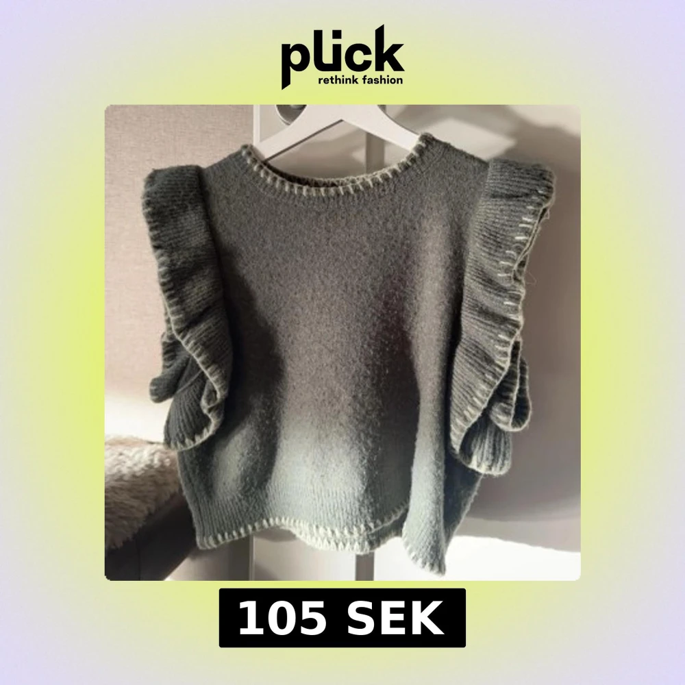 Säljer en grön stickad tröja med unika volangdetaljer längs ärmarna. Tröjan har en rund halsringning med dekorativa sömmar.