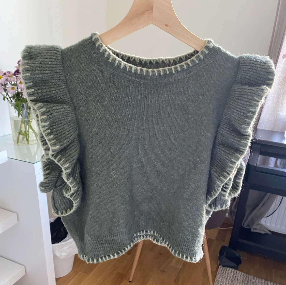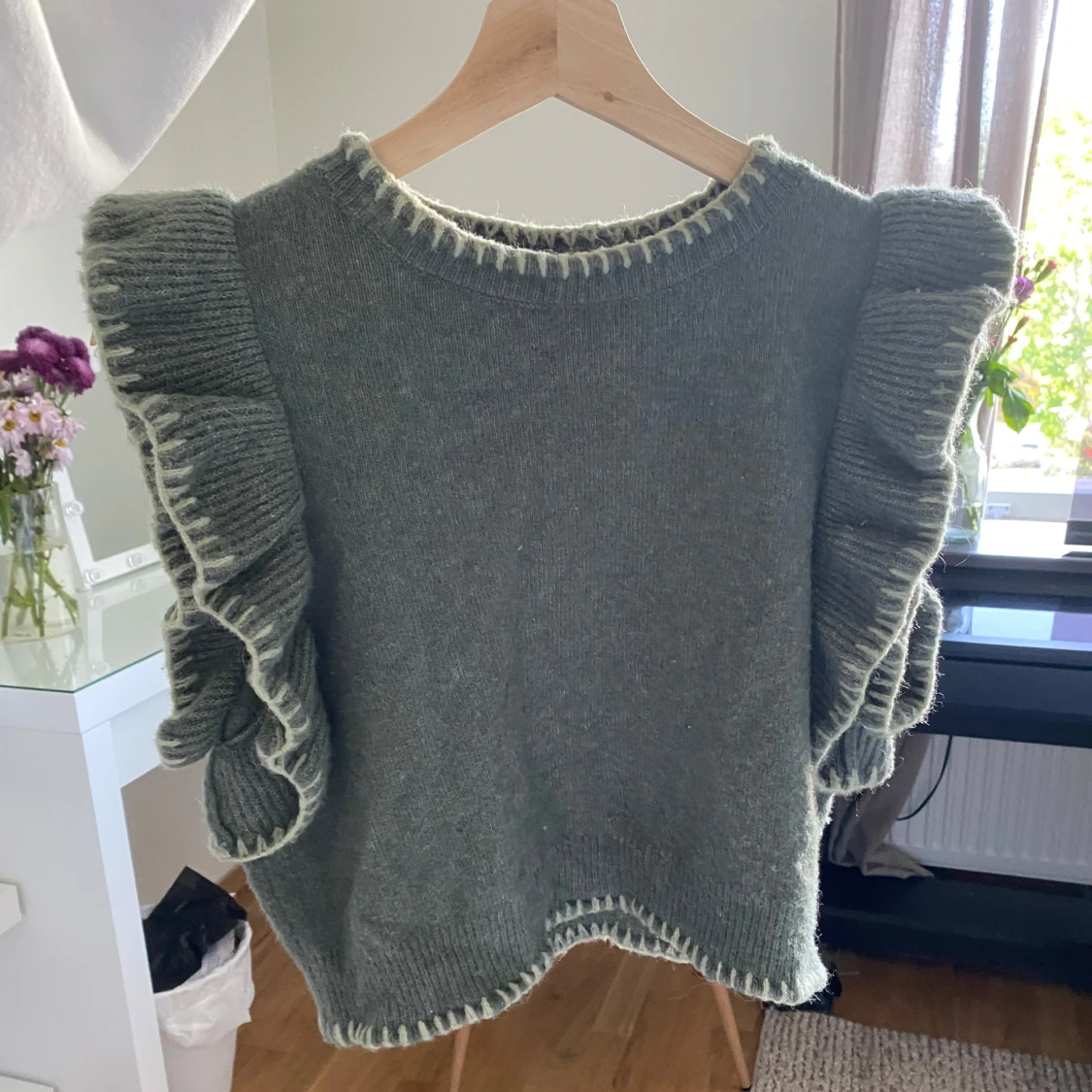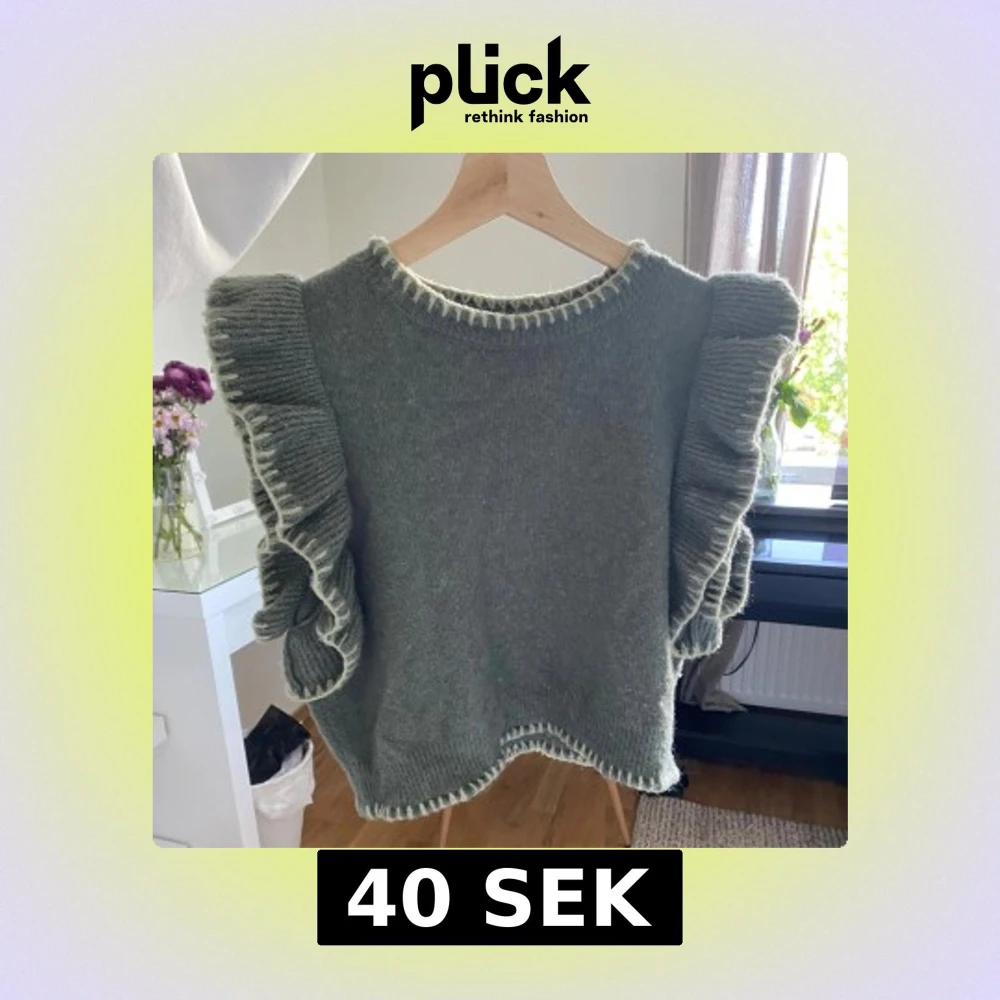 Supersöt grön stickad tröja med breda volanger längs axlarna och kontrastsömmar i ljusare nyans vid hals, ärmar och nederkant. Perfekt för dig som vill ha något unikt och trendigt i garderoben.