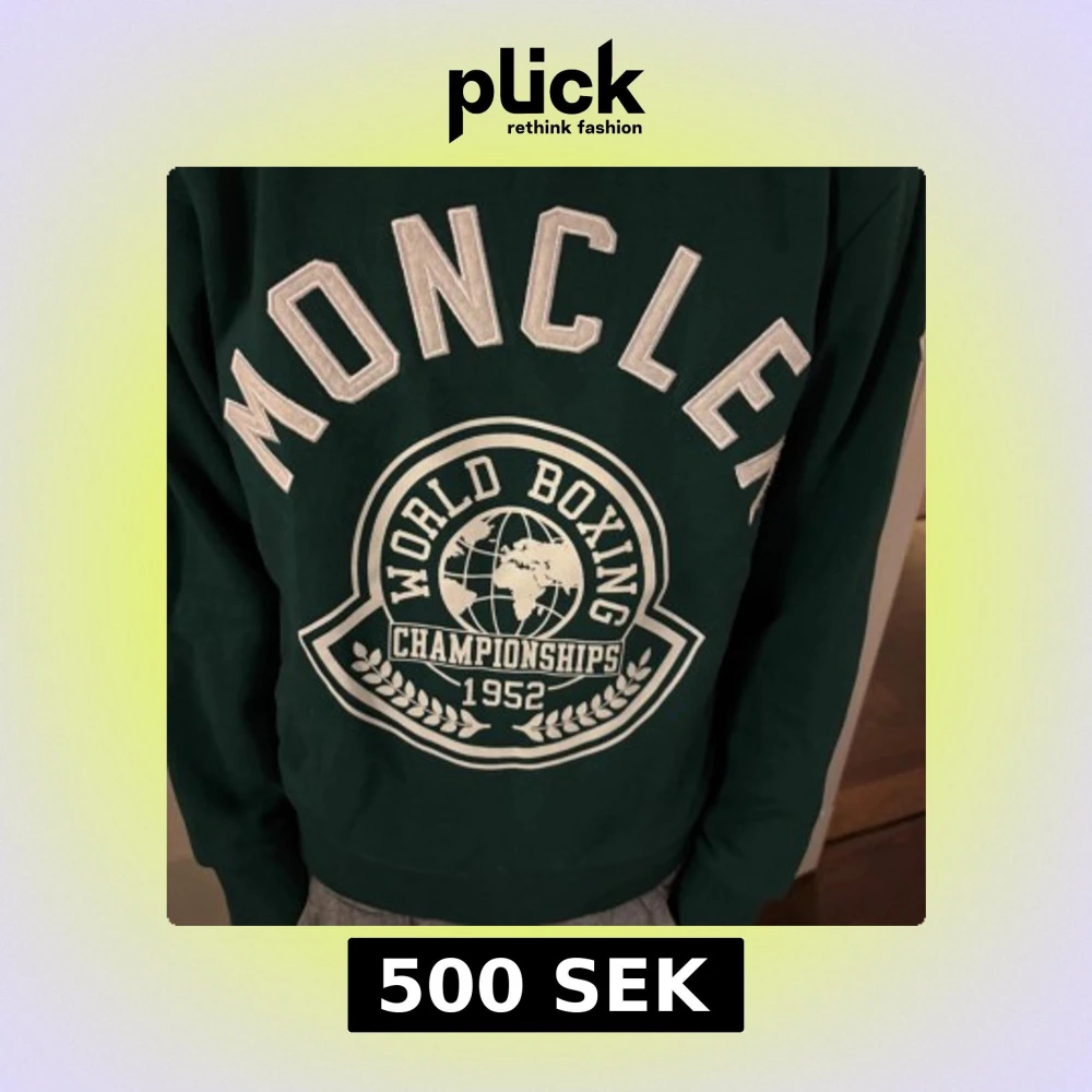 Snygg grön sweatshirt från Moncler med texten 'World Boxing Championships 1952' tryckt på framsidan. Tröjan har långa ärmar och ett Moncler-märke på ärmen. Tröjan är använd ett fåtal gånger.