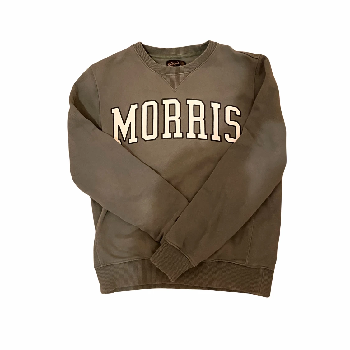 Säljer en stilren grå sweatshirt från Morris med deras logga i vitt på bröstet. Tröjan har långa ärmar och ribbade muddar vid ärmslut och nederkant. Perfekt för en avslappnad stil.