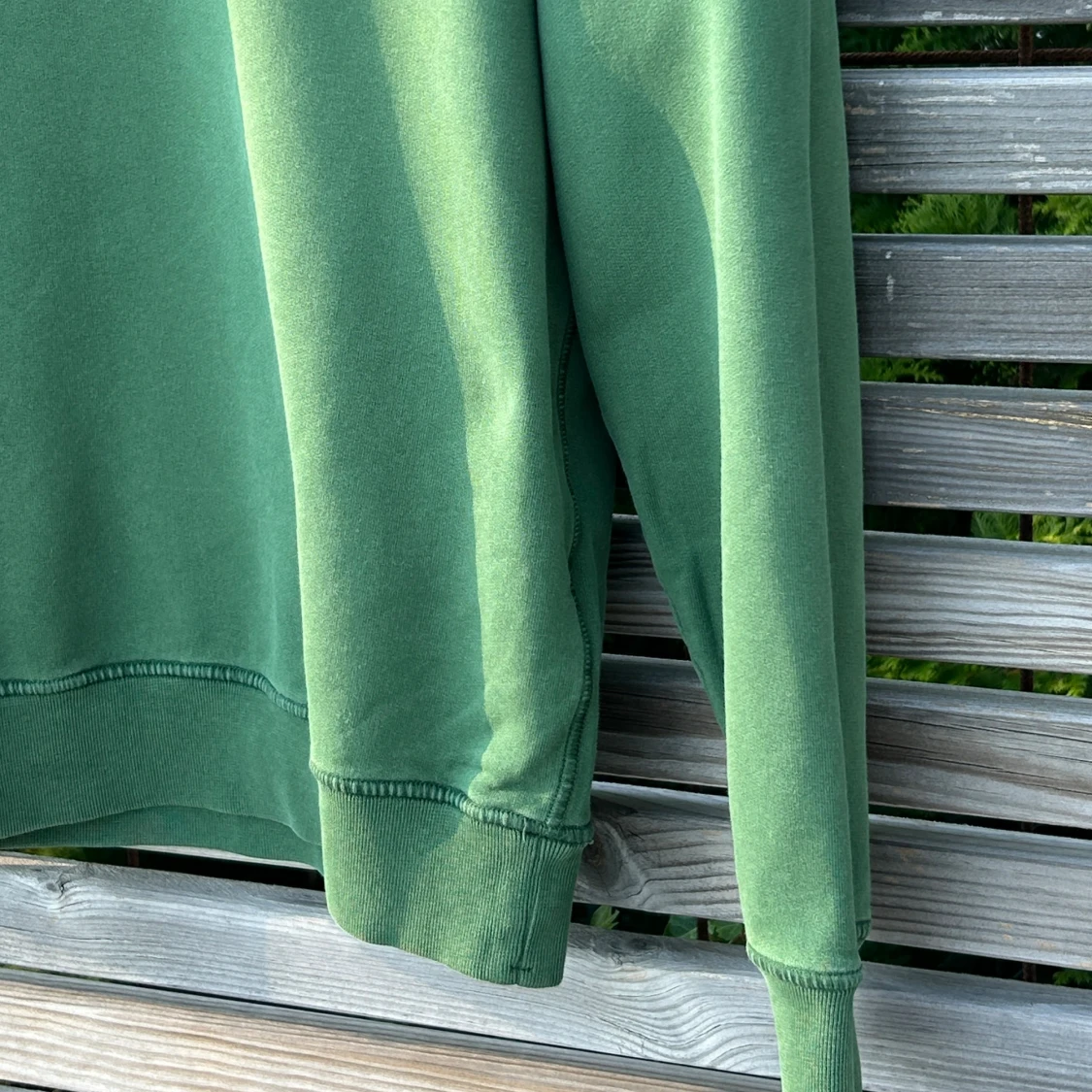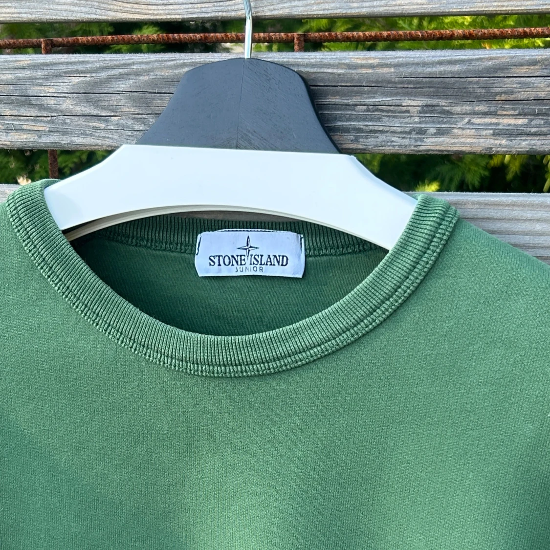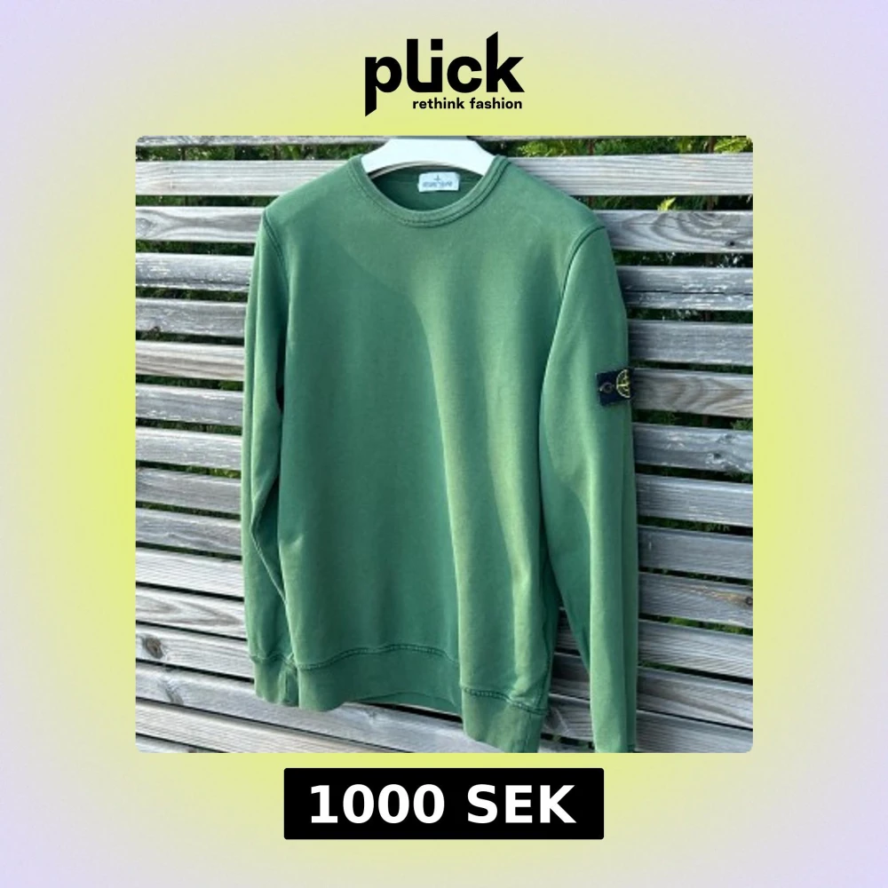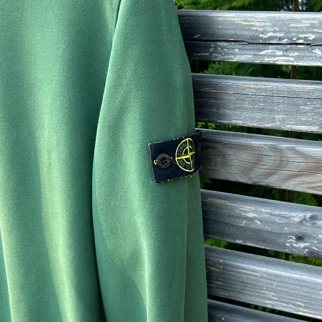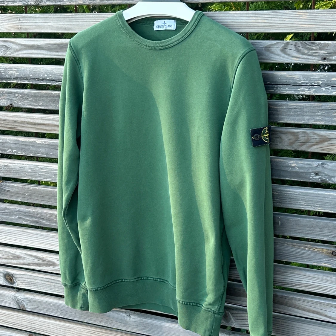 Säljer en grön sweatshirt från Stone Island med klassisk rund hals och ribbade muddar. Tröjan har den ikoniska loggan på vänster ärm och är tillverkad i mjuk bomull. Sicket är 8,5/10