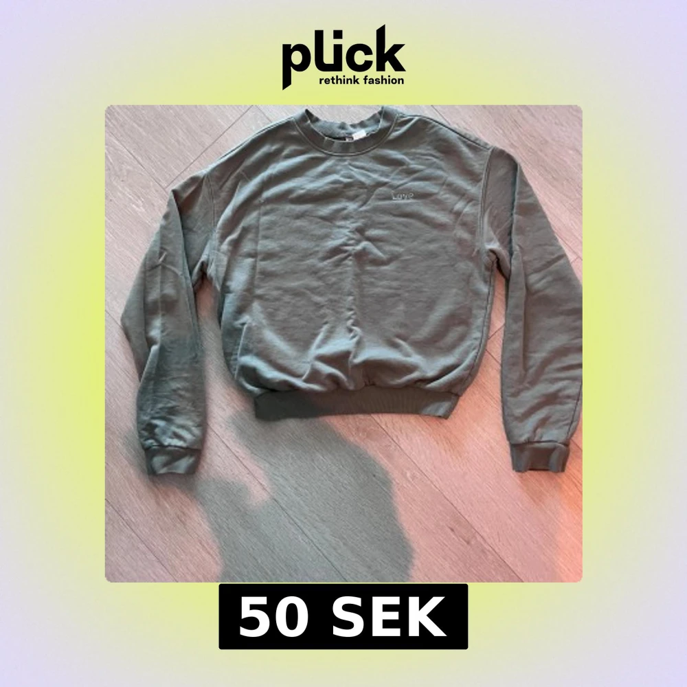 Säljer en grön sweatshirt med rund hals och broderad text 'Love' på bröstet. Tröjan har långa ärmar och ribbade muddar vid ärmslut och nederkant. Perfekt för en avslappnad stil.