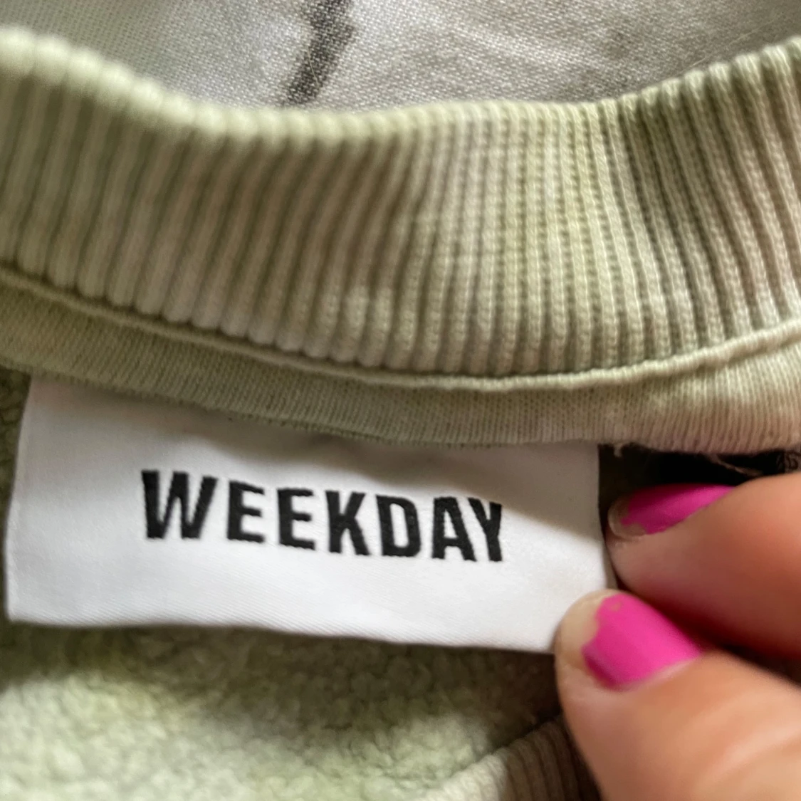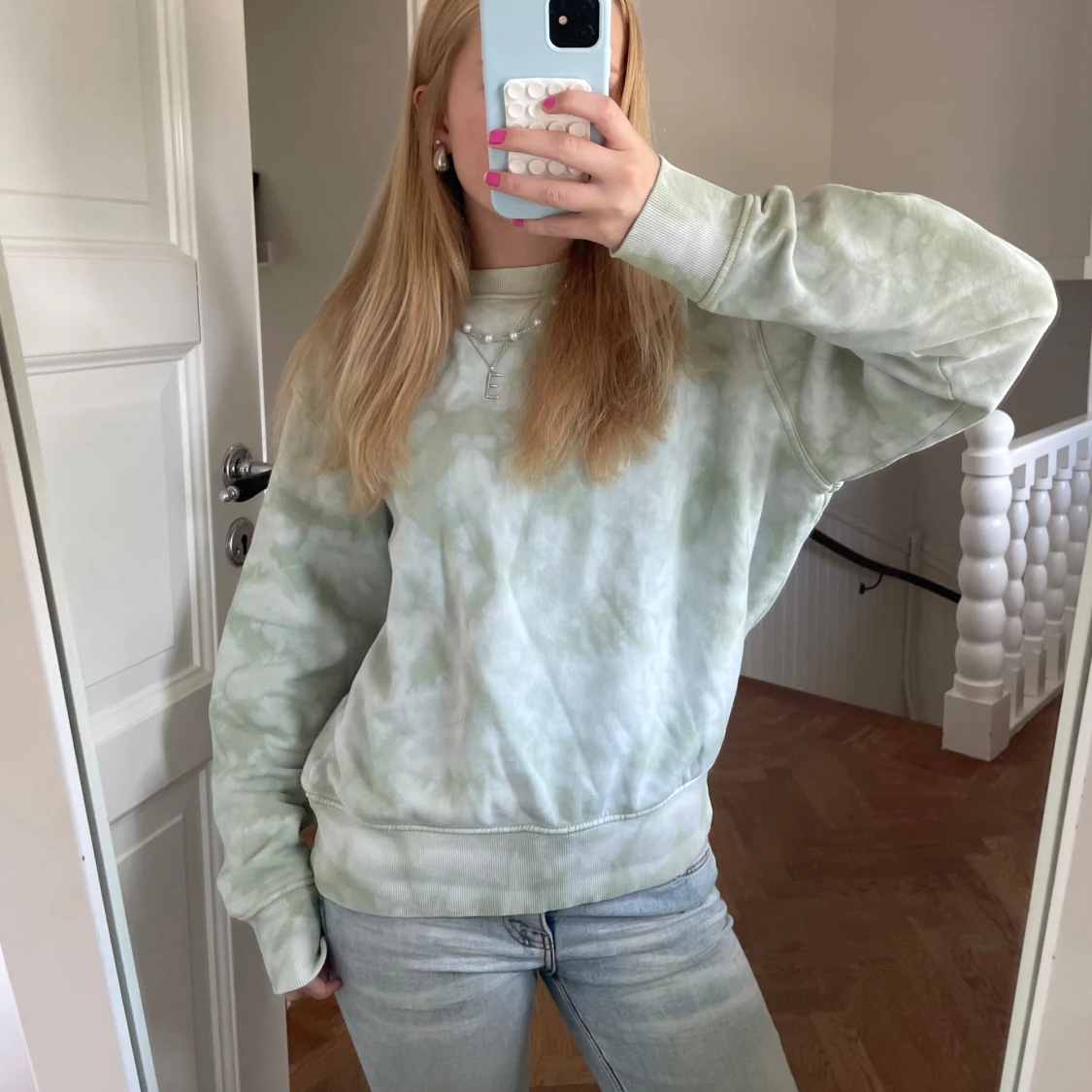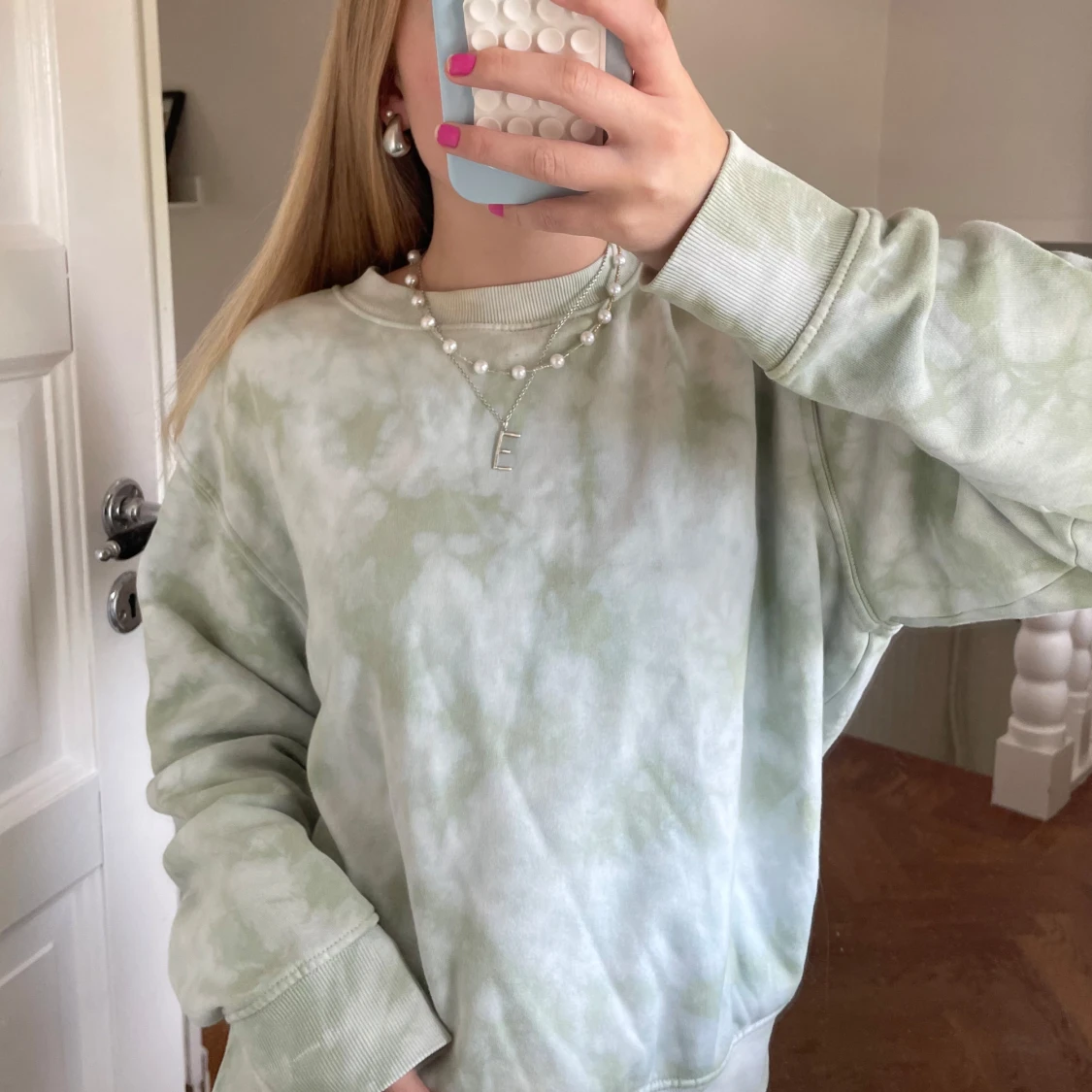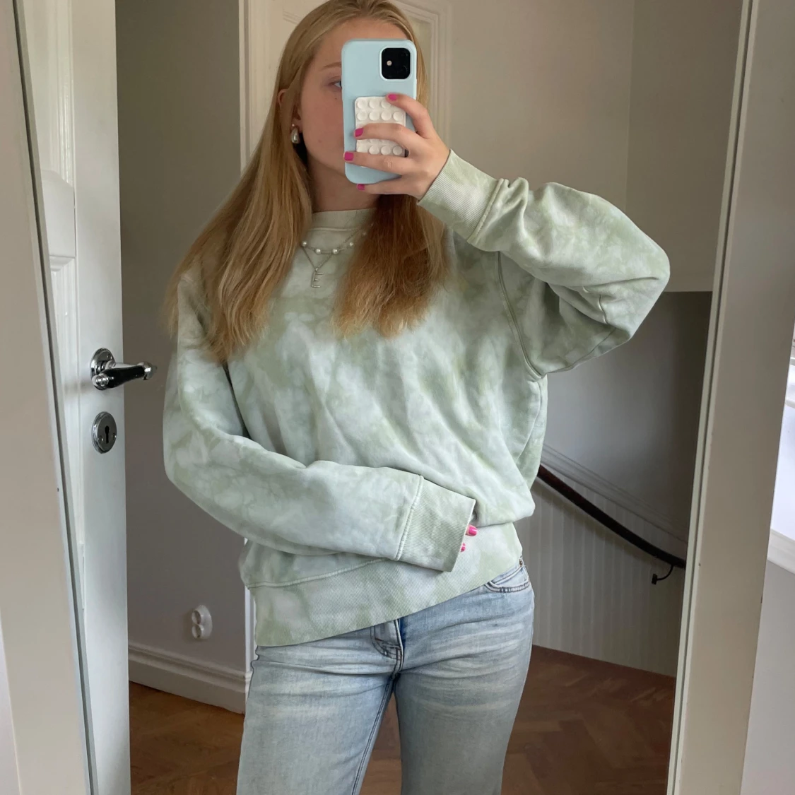 Säljer en oversized sweatshirt från Weekday i ljusgrönt tie-dye mönster. Tröjan har rund hals, ribbade muddar och är långärmad. Perfekt för chill dagar och enkel att styla med jeans eller leggings. Materialet är mjuk bomull som känns skönt mot huden.