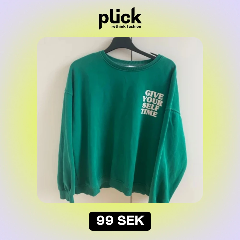Grön tjocktröja med ” give yourself time” på framsidan och baksidan. Skön material och bra i storlek. Tycker den inte är min smak längre så ska sälja den.