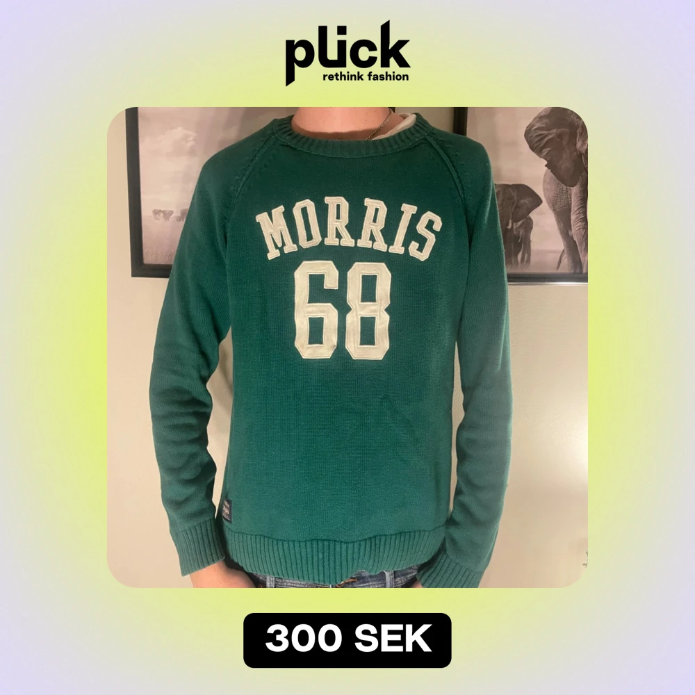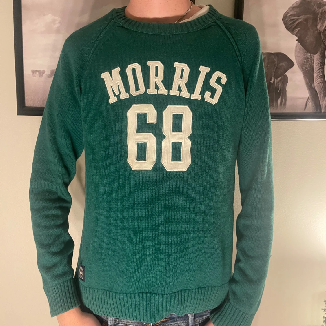 Säljer en snygg grön tröja från Morris med texten 'Morris 68' i vitt på framsidan. Tröjan är i bra skick och har långa ärmar med mörka armbågslappar. Perfekt för höst och vår! NYPRIS cirka 1300 kr