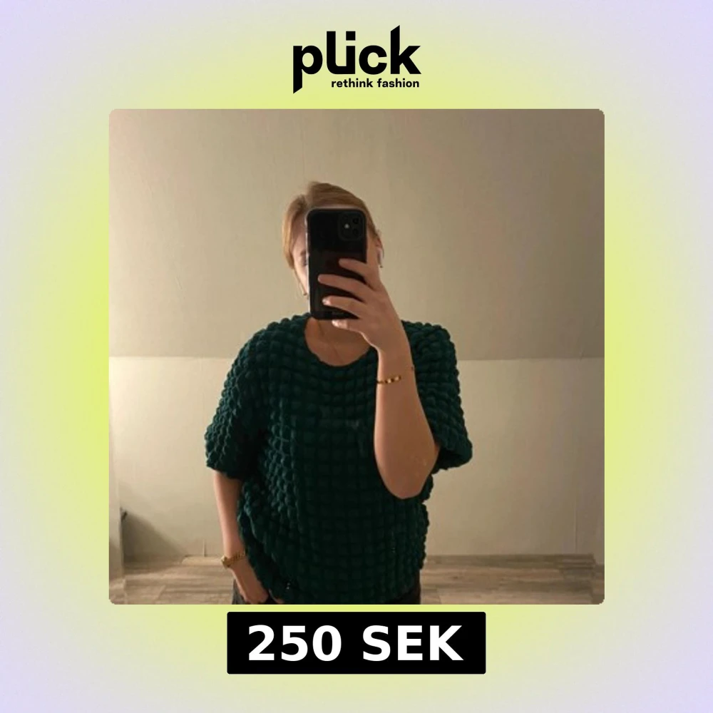 Unik mörkgrön tröja från Rut&Circle i storlek S. Tröjan har en cool bubblig struktur, rund hals och korta ärmar. Den är perfekt för dig som vill sticka ut med en trendig look.