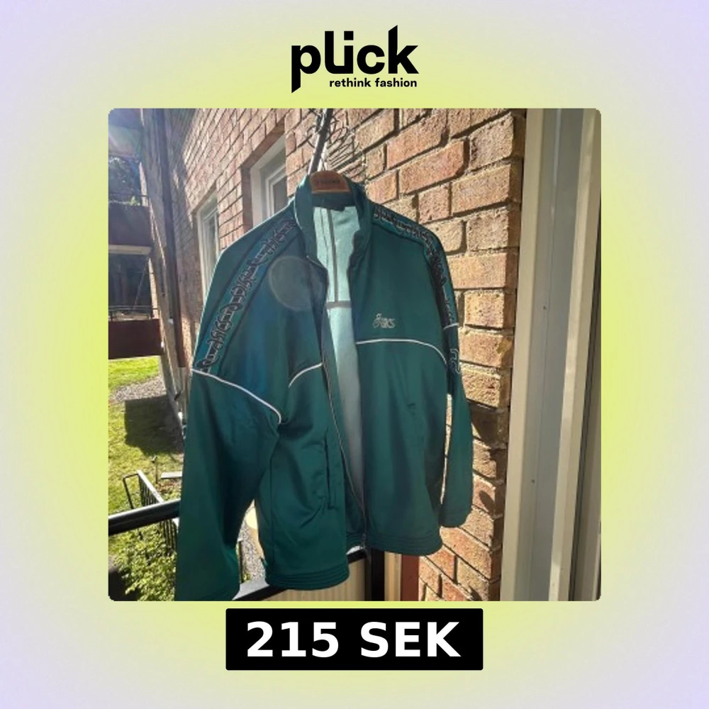 Retro grön vindjacka från Asics med vita detaljer och logga på bröstet och ärmarna. Jackan har dragkedja framtill, ståkrage och två fickor. Snygga kontrastlinjer och tryck längs axlarna ger en sportig vibe. Perfekt för dig som gillar old school streetstyle.