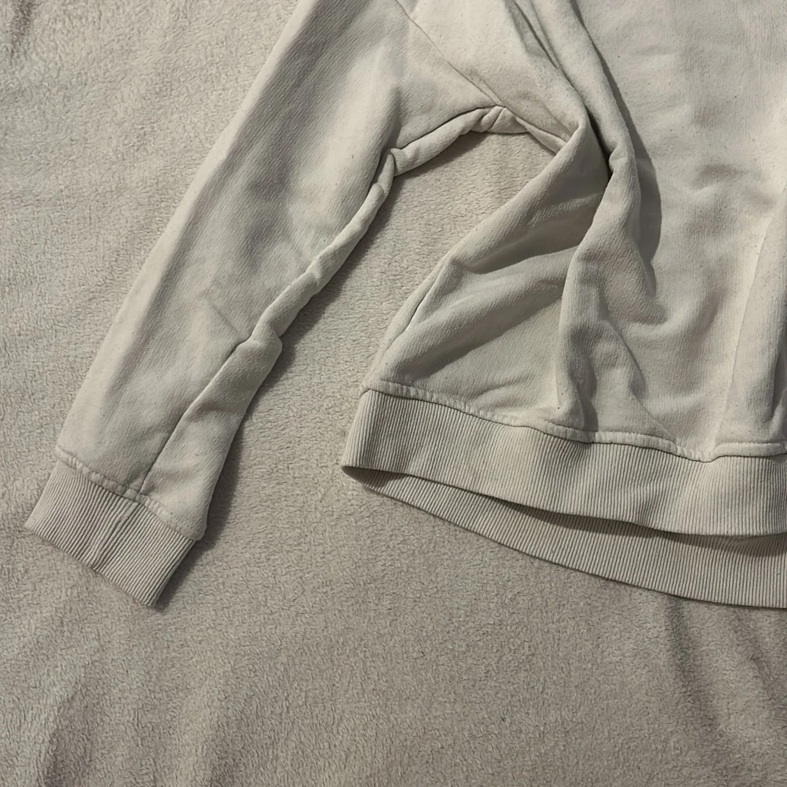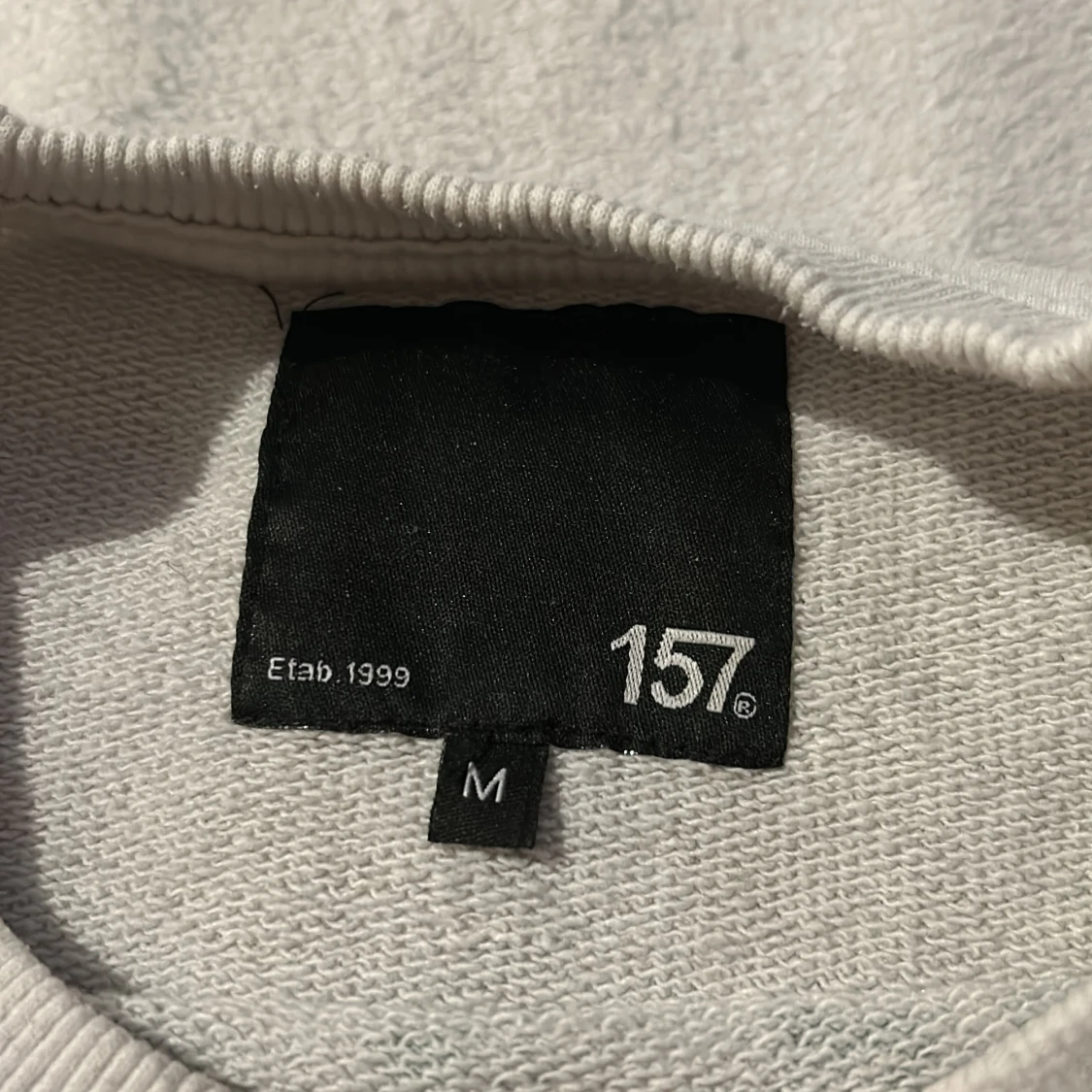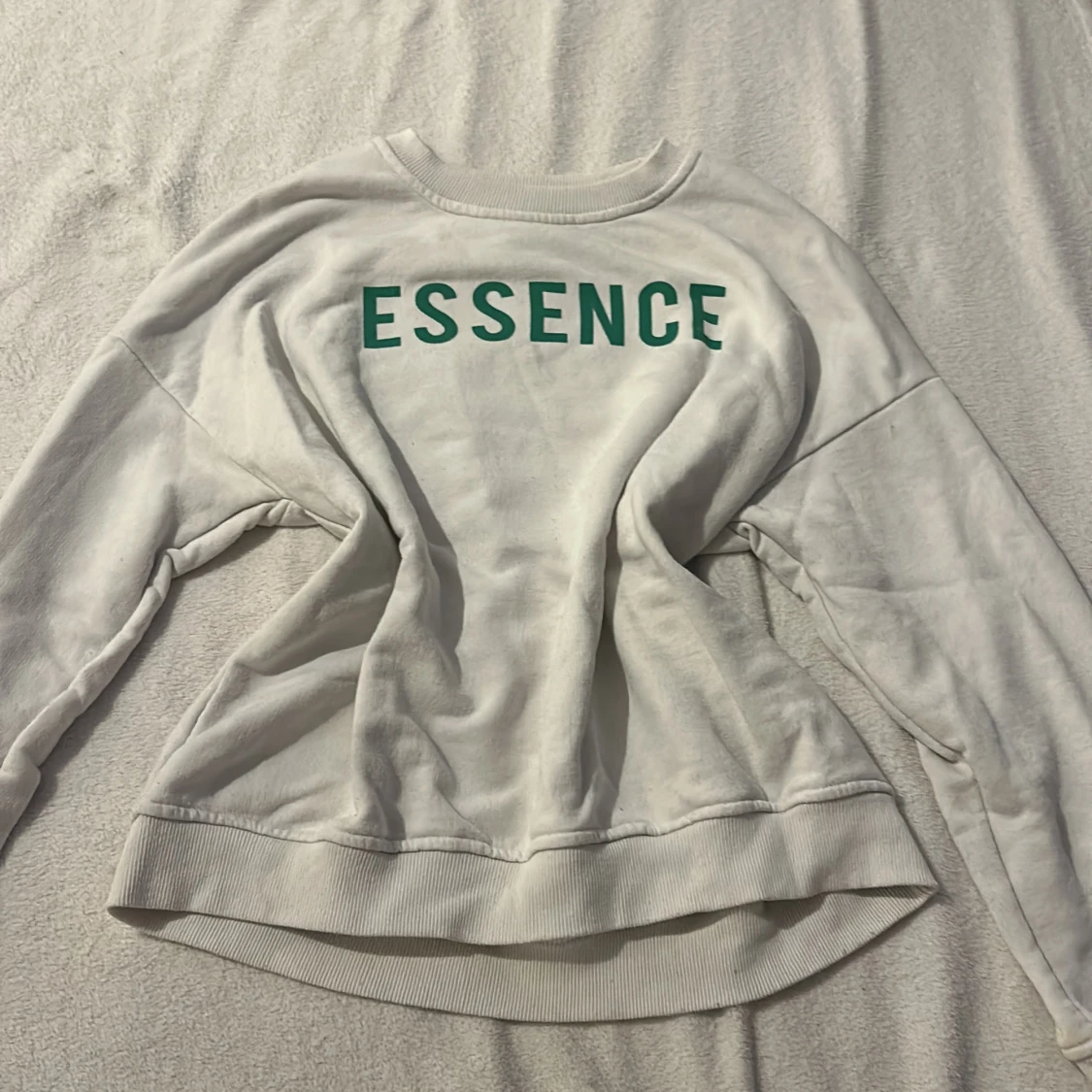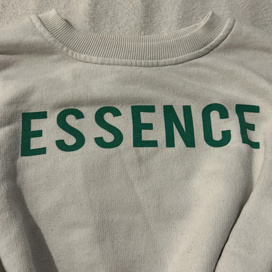 Säljer en vit sweatshirt från 157 med texten 'ESSENCE' i grönt på framsidan. Tröjan har långa ärmar och ribbade muddar vid ärmslut och nederkant. Perfekt för en avslappnad stil.