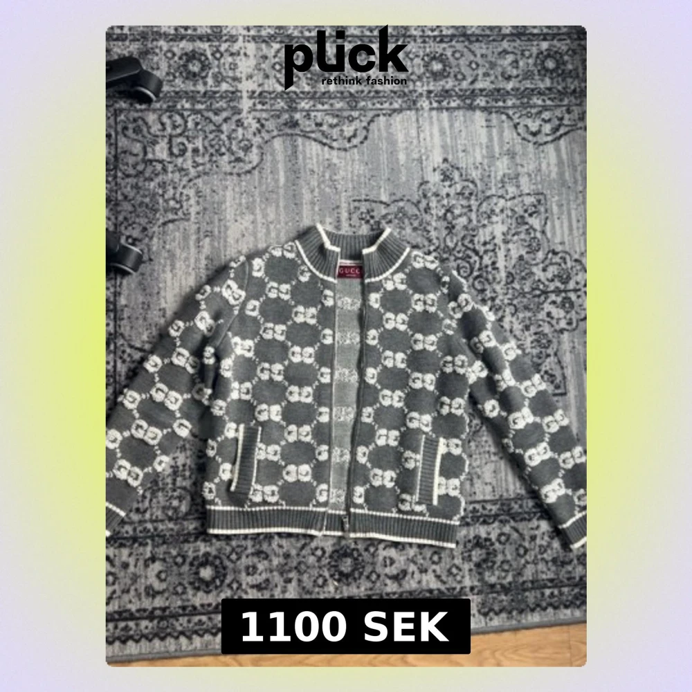 Säljer en grå stickad kofta från Gucci med vit GG-monogram över hela plagget. Koftan har dragkedja framtill, ribbade muddar och två fickor. Perfekt för dig som gillar exklusiv streetwear och vill sticka ut med en ikonisk design.