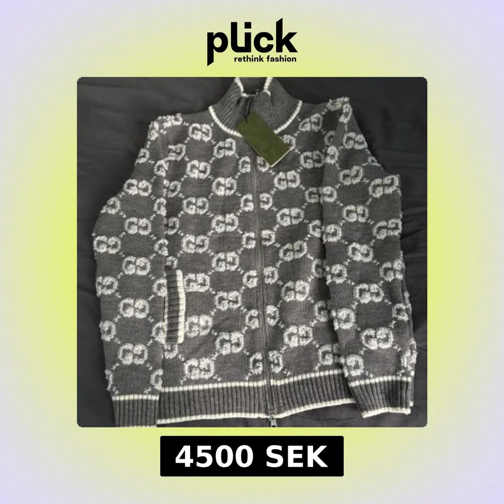 Säljer en grå och vit kofta från Gucci med ikoniskt GG-mönster över hela plagget. Koftan är stickad i ull, har ribbade muddar, hög krage och dragkedja framtill. Perfekt för dig som vill ha en lyxig och snygg look med designer vibe.
