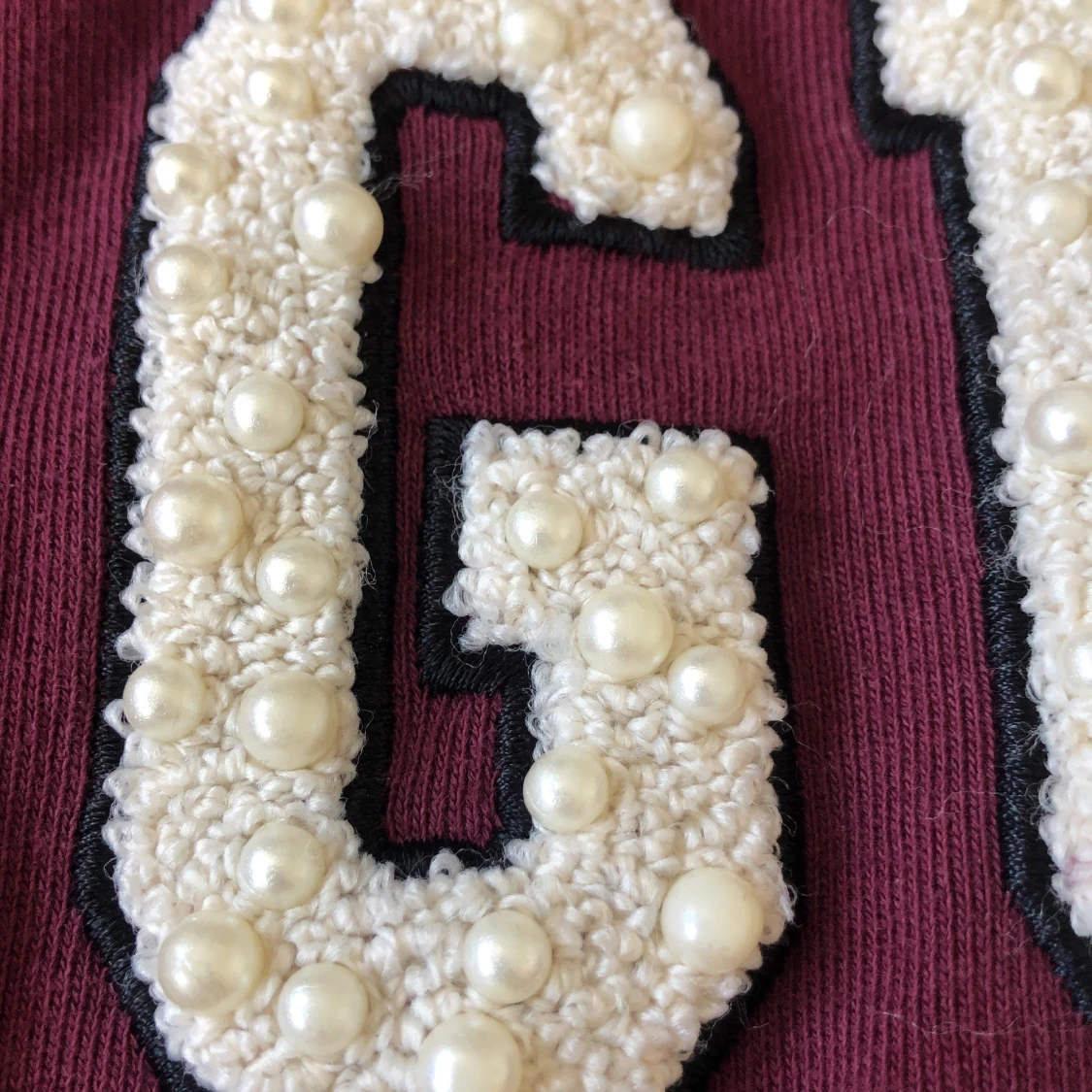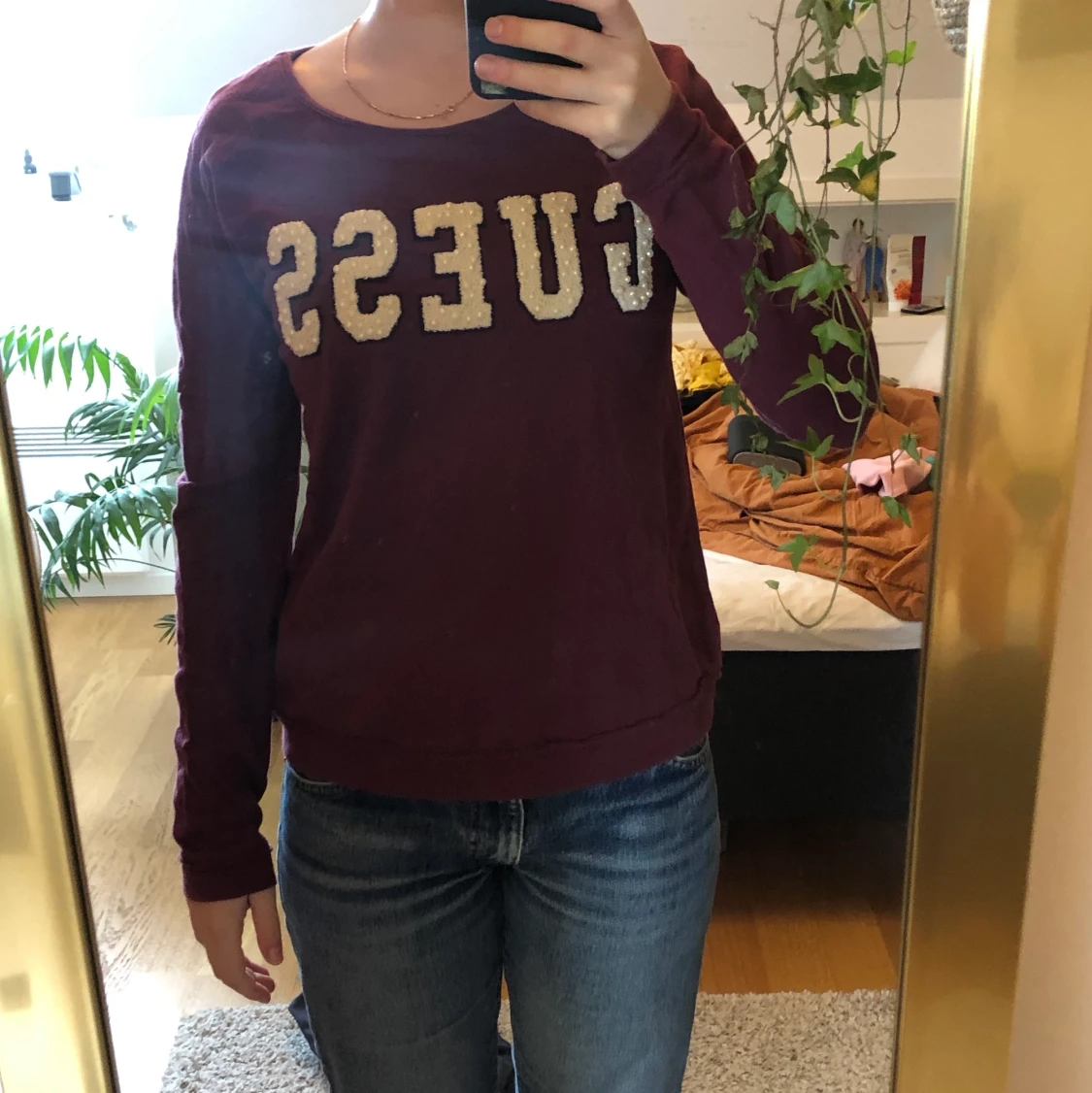 Lite tjockare tröja från Guess. Fina pärlor i texten. Oklart vilken storlek men skulle slänga XS-S.