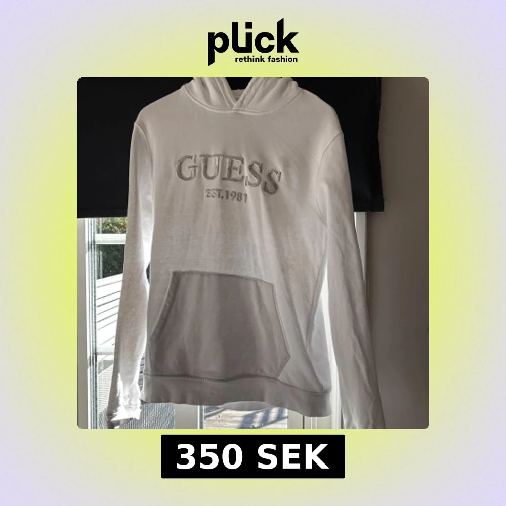 Vit hoodie från Guess med broderad logga och texten 'EST. 1981' framtill. Klassisk känguruficka och huva. Långärmad och i mjukt bomullsmaterial, perfekt för chill dagar. Enkel och stilren design som funkar till det mesta. Den har en fläck på bröstet vet inte var den kommer ifrån, PRIS EJ HUGGET I STEN kom med bud!