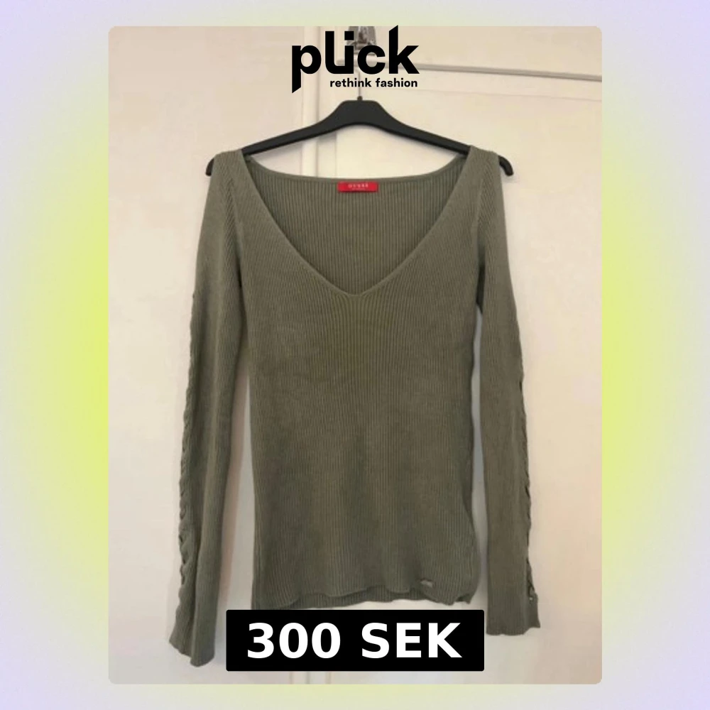 Snygg olivgrön ribbad tröja från Guess med v-ringad hals och långärmade ärmar. Tröjan har flätad detalj längs ärmarna som ger en cool touch. Perfekt att styla med jeans eller kjol för en trendig look.
