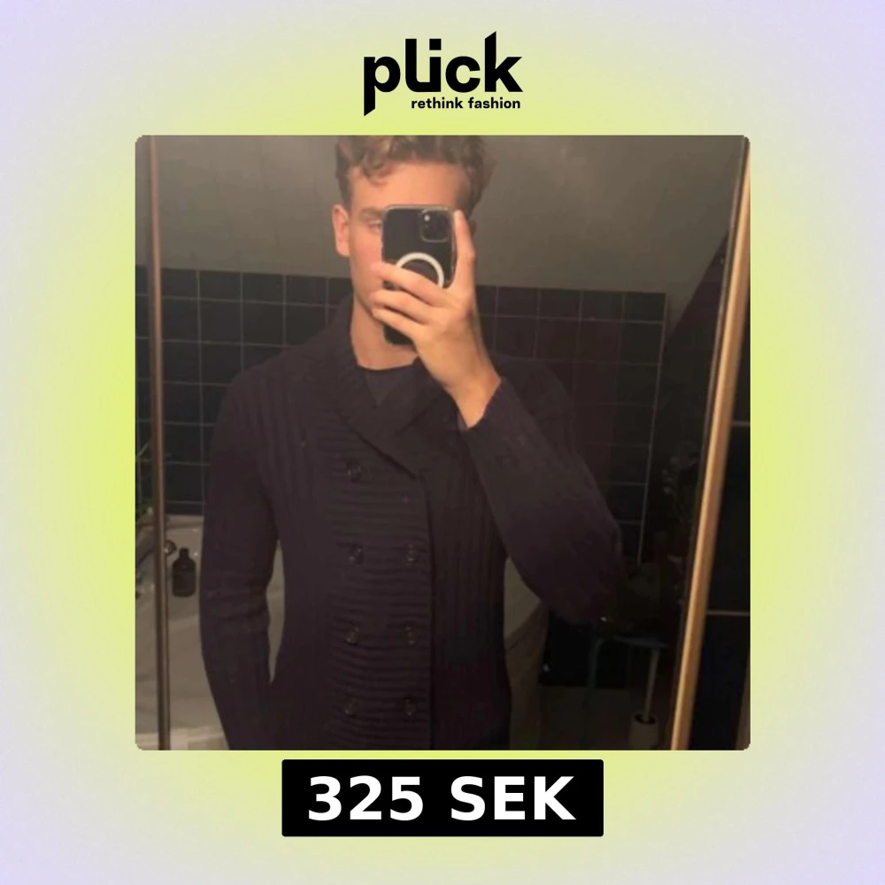 Säljer en mörkblå, ribbstickad kofta med bred krage och dubbla rader svarta knappar framtill. Koftan har lång ärm och är gjord i ett mjukt, stickat material som passar perfekt till kyligare dagar.