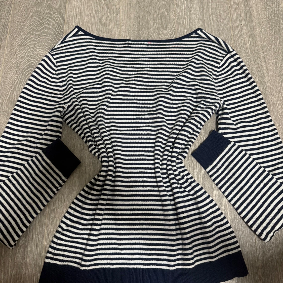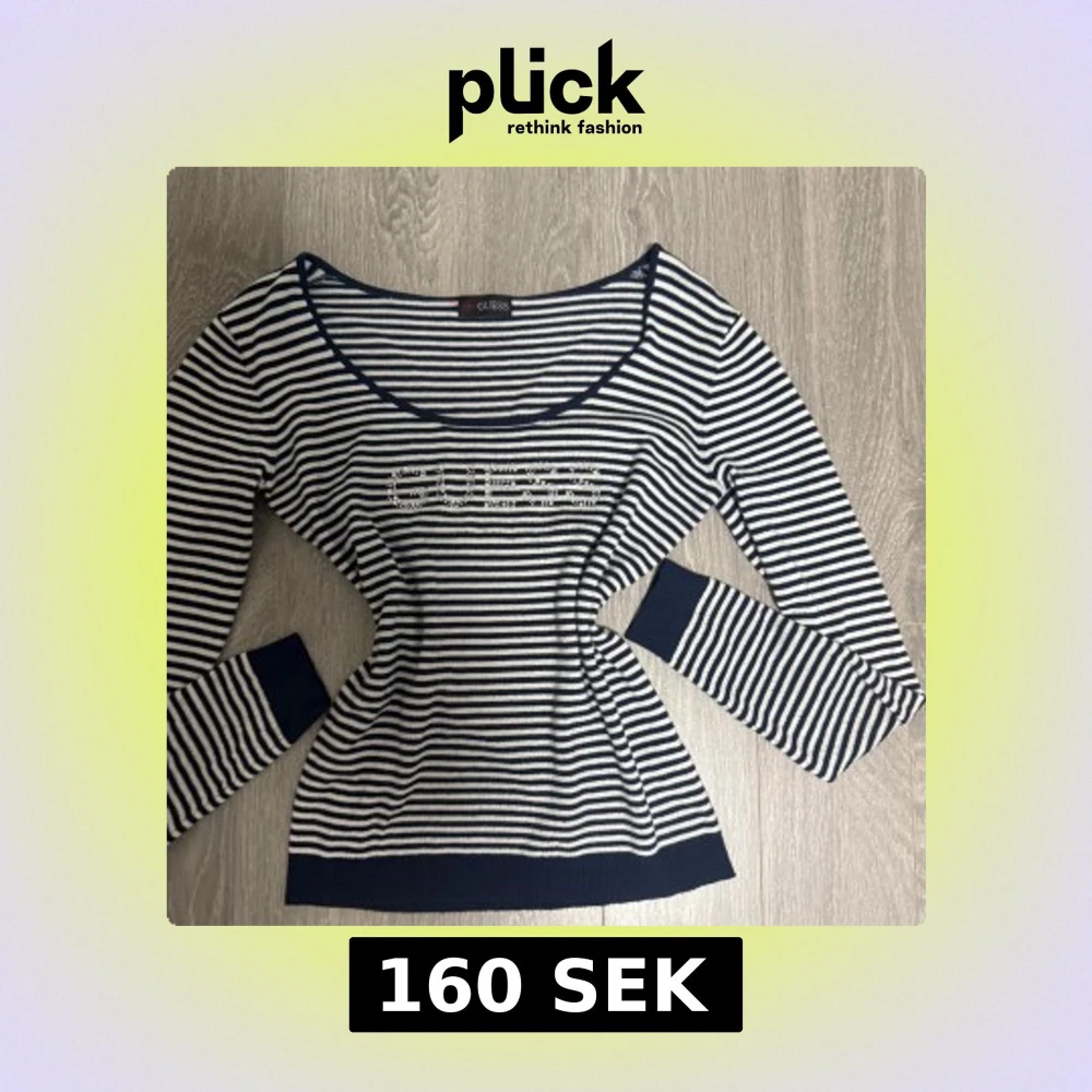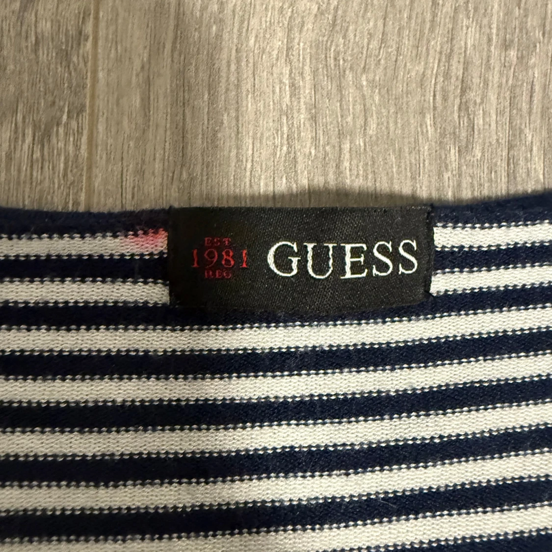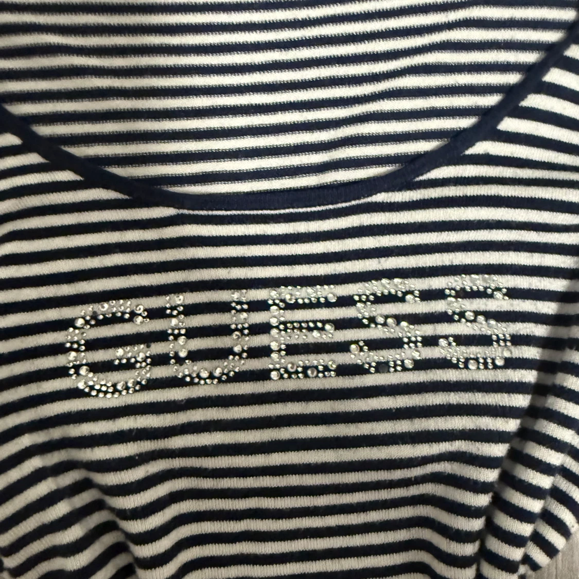 Snygg långärmad tröja från Guess med marinblå och vita ränder. Tröjan har rund halsringning och Guess-loggan framtill i glittriga stenar. Muddar vid ärmslut och nederkant ger en schysst passform. Perfekt för dig som gillar klassisk men trendig stil.