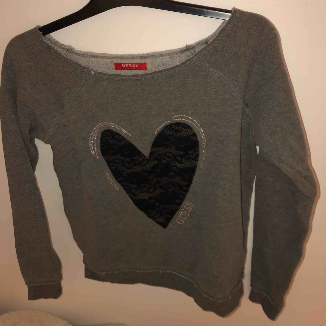 Grå myströja från GUESS med svart spetshjärta på. Mjukt material inuti och lite större i halsen men snyggt att ha den lite nerhängande över ena axeln. Riktigt gott skick och nästan helt oanvänd