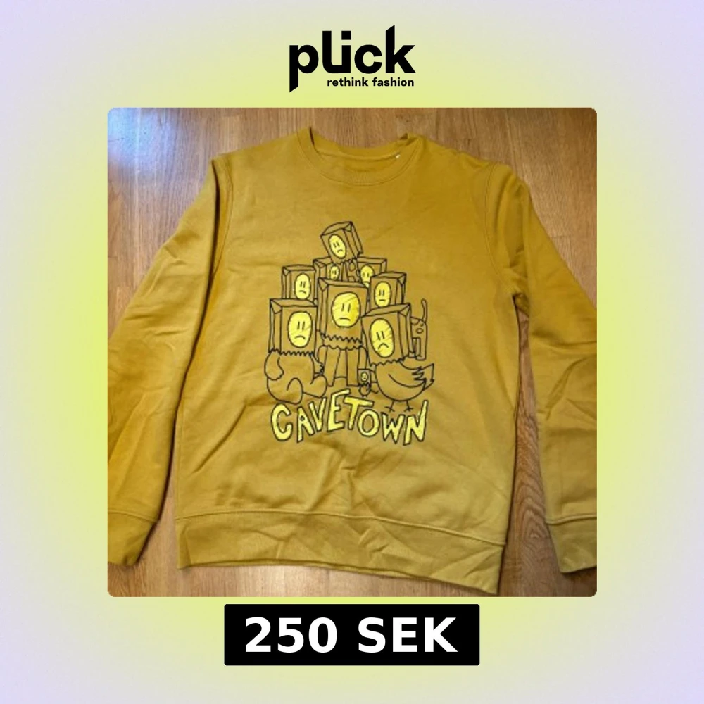Gul sweatshirt från Cavetown med unikt tryck av figurer med kartonghuvuden och texten 'Cavetown' på framsidan. Tröjan har rund hals, långa ärmar och är gjord i mjuk bomull. Perfekt för dig som gillar coola bandmerch och vill sticka ut. Pruta gärna. 💕