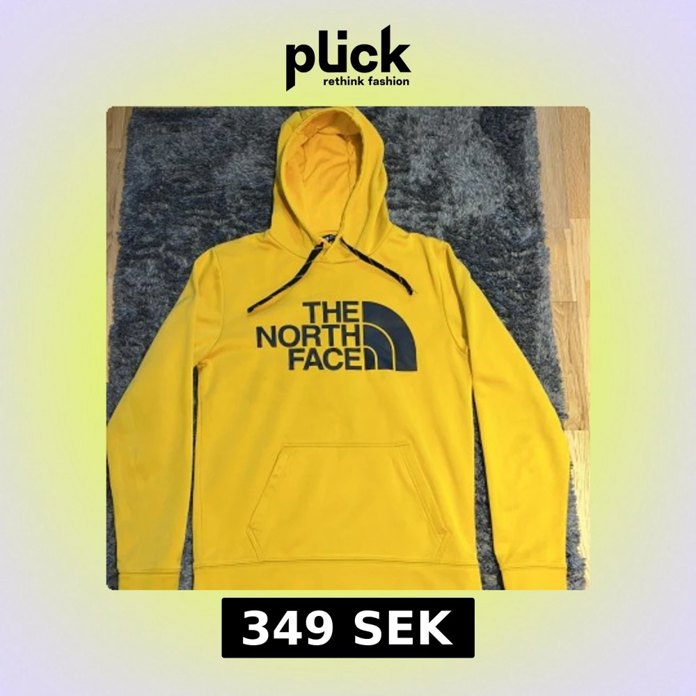 Säljer en gul hoodie från The North Face med stor svart logga på bröstet. Tröjan har huva med svarta snören, känguruficka och långa ärmar. Materialet är mjuk polyester som känns skönt mot huden. Perfekt för chill dagar eller när du vill sticka ut med färg.
