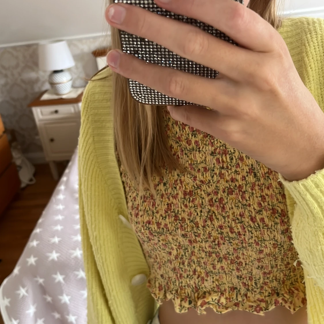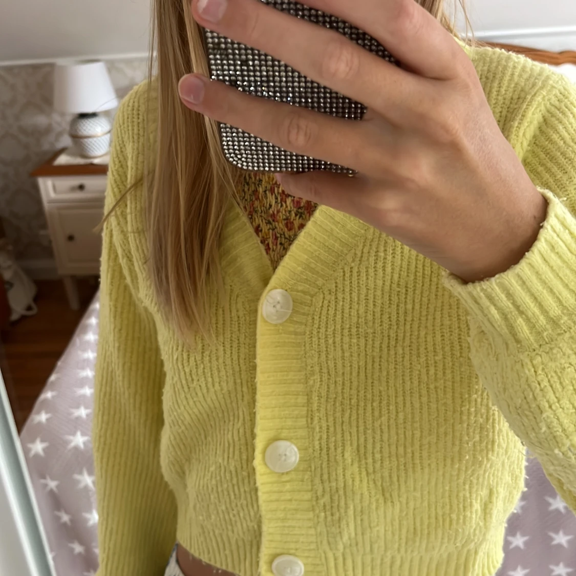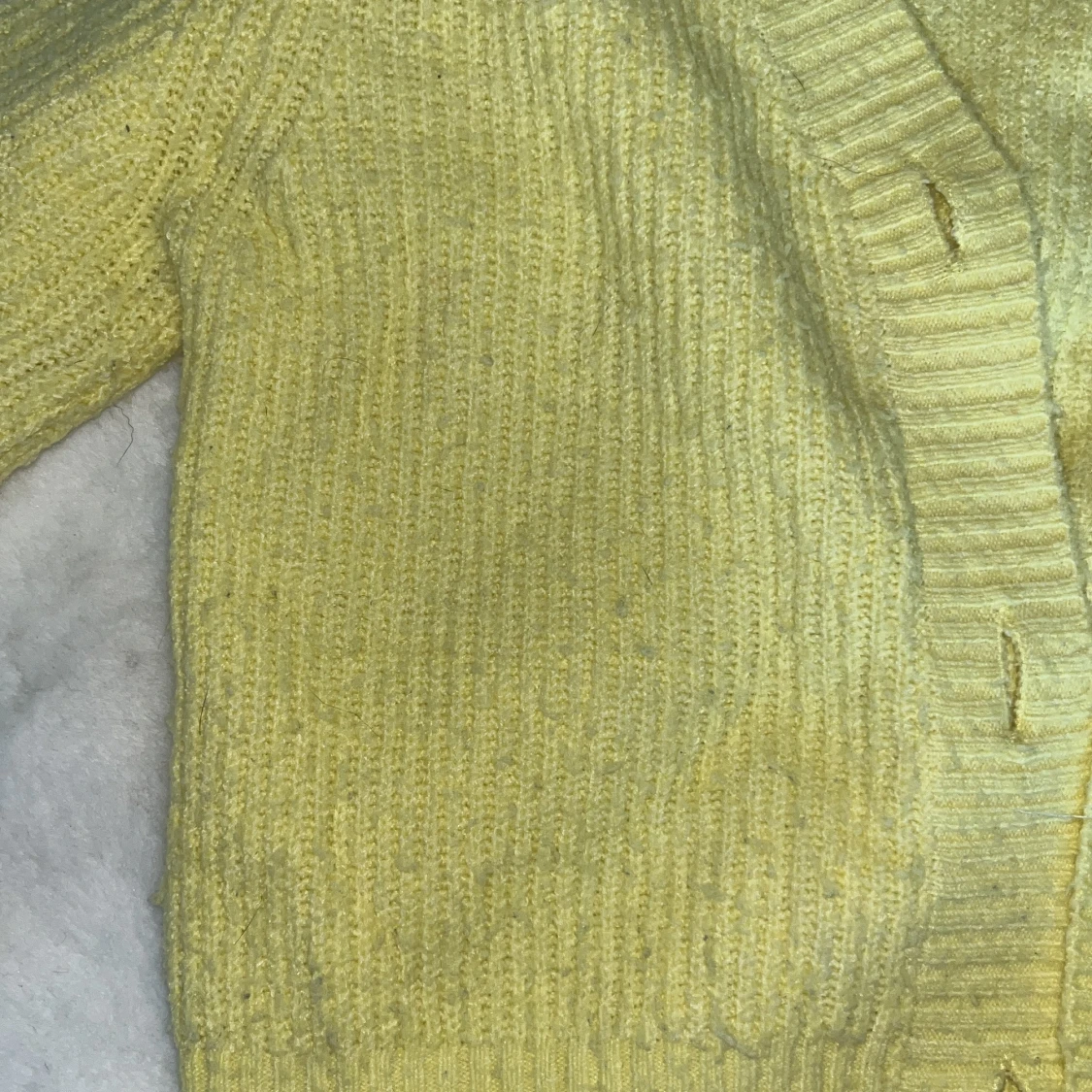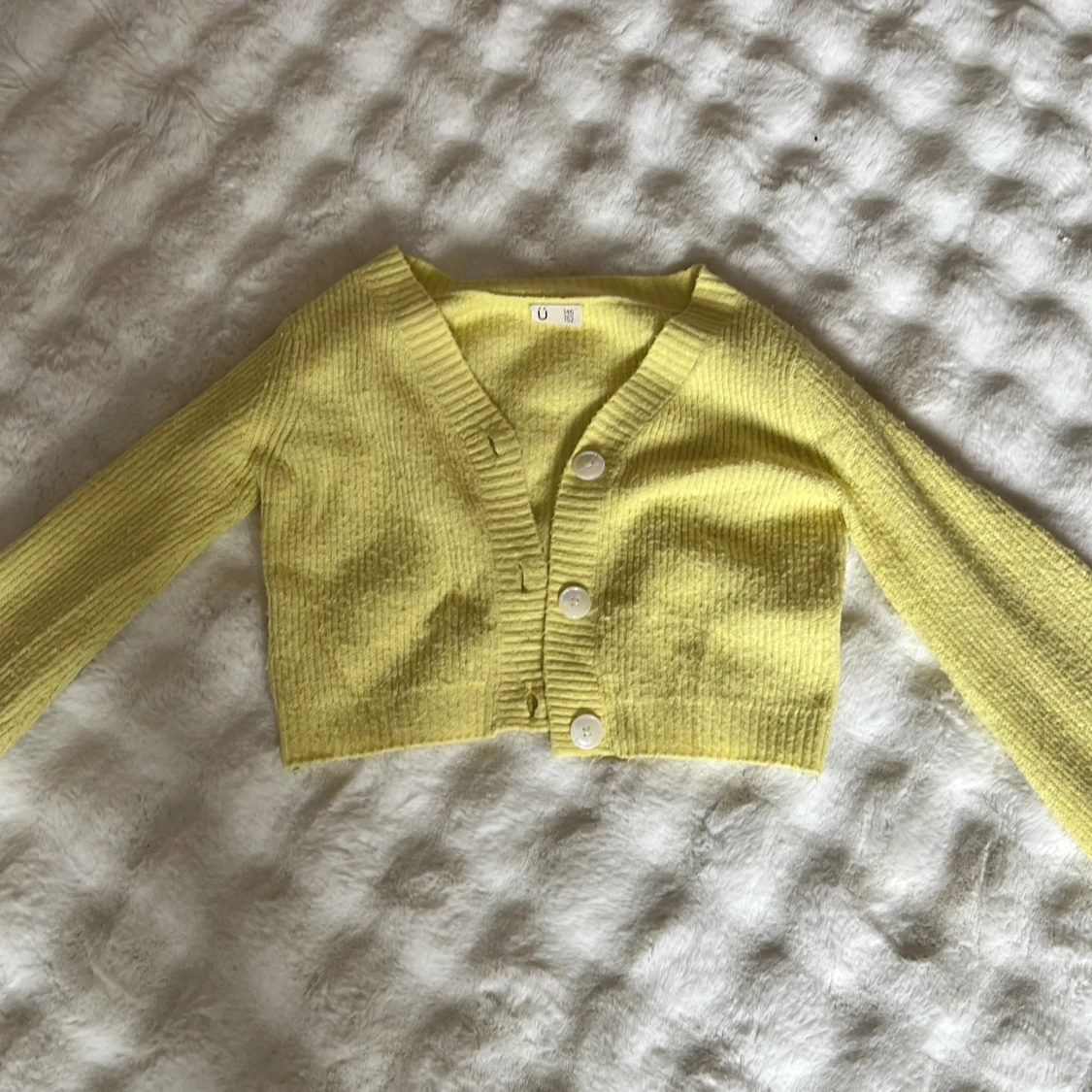 Superfin ljusgul kort kofta från Kappahl med croppad passform. Stickad i mjukt material, v-ringad och med stora vita knappar framtill. Perfekt att slänga över en topp för en chill och trendig look. Den är inte använd jättemycket men är lite nopprig. Står att den är stl 146/152, men passar mig som har XS-S. Kan köpas med toppen jag har på mig under för 80 kr eller bara koftan för 50 kr (priset går att diskutera). Man kan också bara köpa toppen jag har under för 50 kr, annons finns i min profil❤️