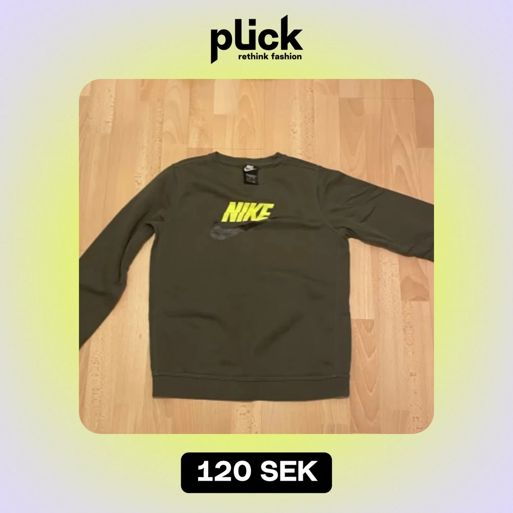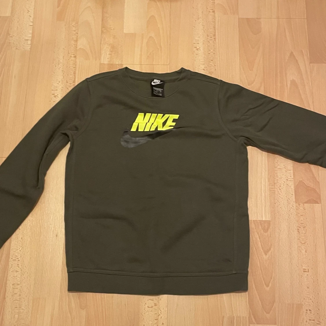 Säljer en snygg olivgrön sweatshirt från Nike med deras ikoniska logga i gult på bröstet. Tröjan har långa ärmar och är perfekt för en avslappnad stil. Den är i nyskick och är oanvänd!