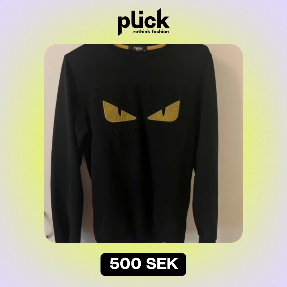 Säljer en svart tröja från Fendi med ett coolt ögonmotiv i gult på framsidan. Tröjan har långa ärmar och är perfekt för en stilren och edgy look. Passar både till vardags och fest!