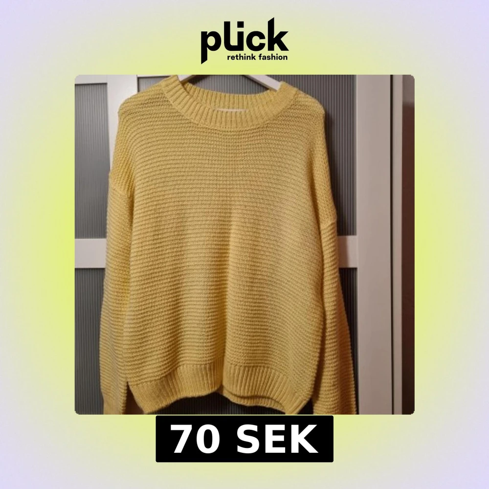Säljer en mysig gul stickad tröja med rund hals och långa ärmar. Perfekt för kyliga dagar och ger en härlig färgklick till garderoben. Passar bra till jeans eller kjol för en avslappnad look.