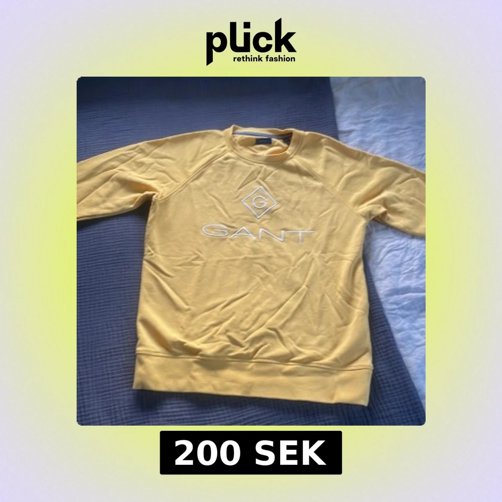 Snygg gul sweatshirt från GANT med broderad logga i vitt framtill. Tröjan har rund halsringning och långa ärmar. Den är knappt använd så väldigt bra skick! Lite skrynklig på bilden 😅 men det går bort i tvätten. Stl. 170/15 år. Jag skulle säga att den passar XS.