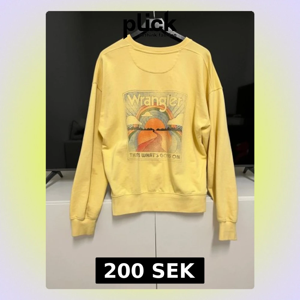 Säljer en gul sweatshirt från Wrangler med retrotryck på ryggen och liten Wrangler-logga på bröstet. Tröjan har rund hals, långa ärmar och ribbade muddar. Materialet känns mjukt och bekvämt, perfekt för chill dagar. Färgglad design med vintage-vibbar. Tror inte de är officiel merch men vet ej