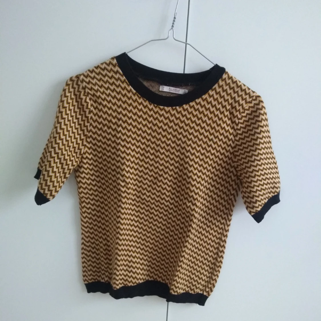 Tröja i bärnstensgul och svart, använd få gånger, köpt på Pull&Bear. Går ned till ovanför rumpan.