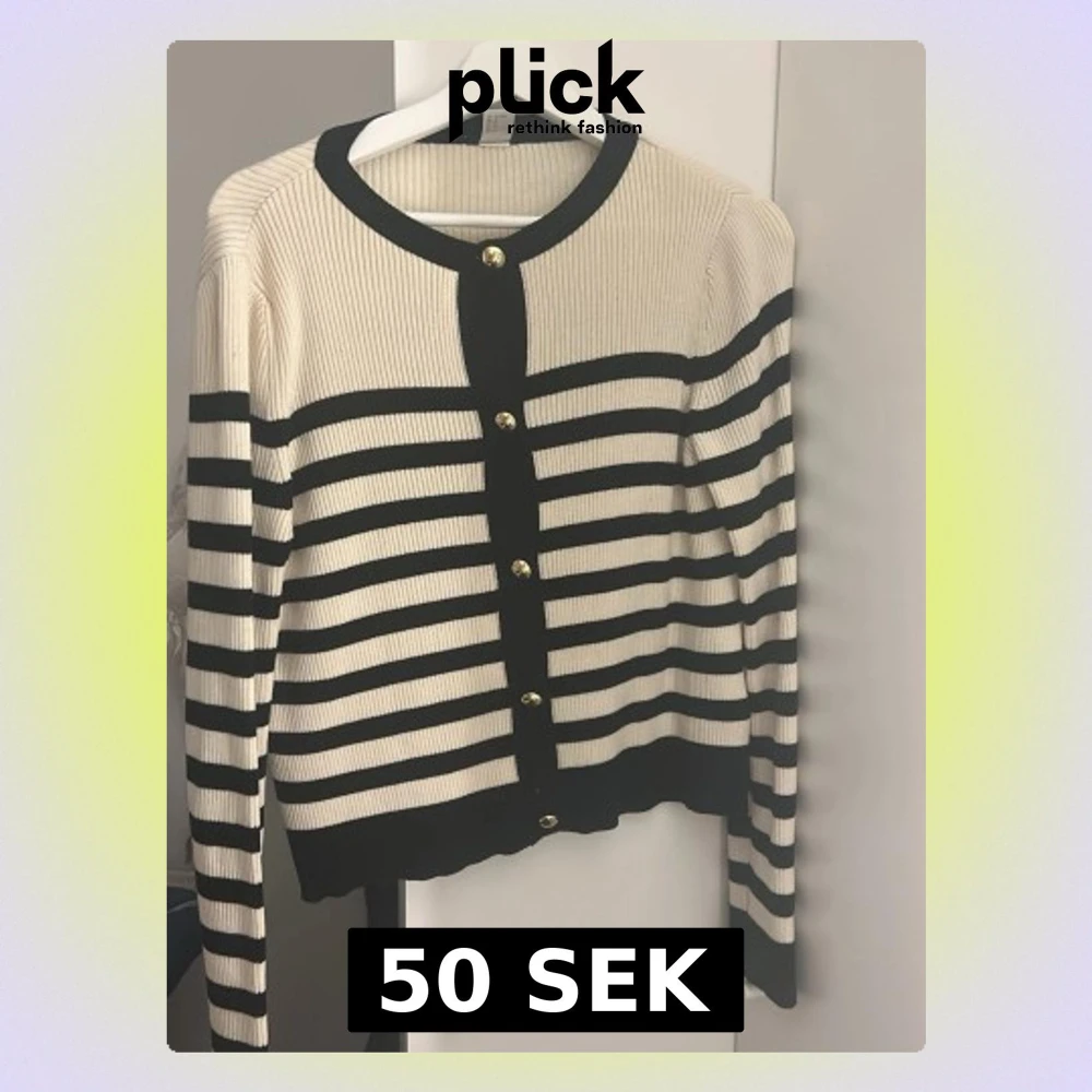 Snygg ribbad kofta i beige och svart med horisontella ränder och dekorativa guldknappar framtill. Långärmad och med svart kant vid hals, knappslå och nederkant. Perfekt för lager-på-lager och ger en stilren look.